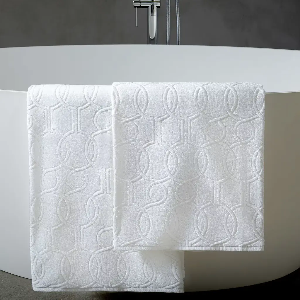 This sophisticated cotton sponge set comprised of a face towel (60x100cm) and a guest towel (40x60cm) is a fine addition to refined private and hospitality decors, alike. The jacquard patterns are borrowed from Japanese friezes and reveal their exclusive character, further stressed by the corners' slightly rounded profiles. Please consult the Concierge for care instructions.