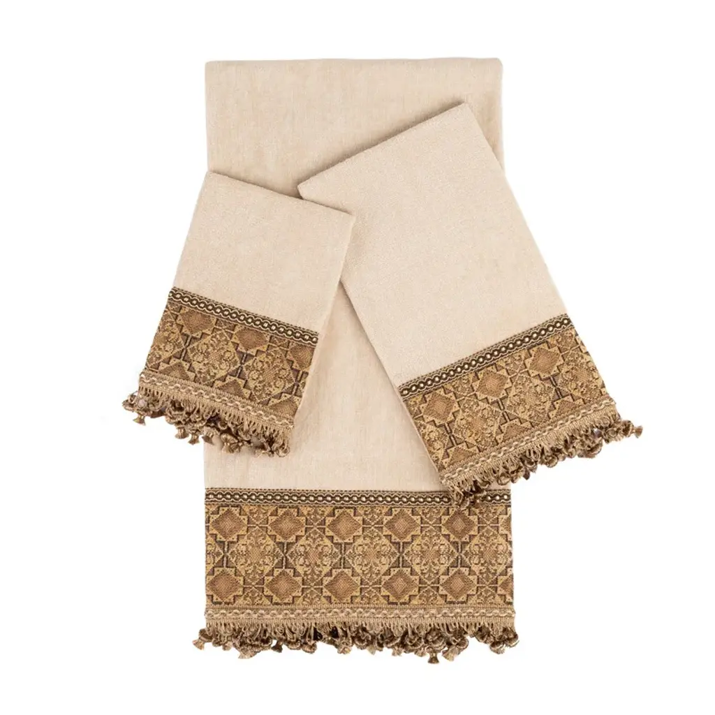100% Cotton velour towel * Add a final touch to your elegant living with this decorative towel by Sherry Kline. * This decorative towel is designed by the Austin Horn brand design team and each piece is expertly handcrafted by artisans with the most luxurious fabrics and decorative trims. * This towel can be a luxury and easy addition to any bathroom to scale-up the ambiance tastefully. * This decorative towel can be an ideal gift for any occasion. * Care instructions: Spot cleaning recommended.