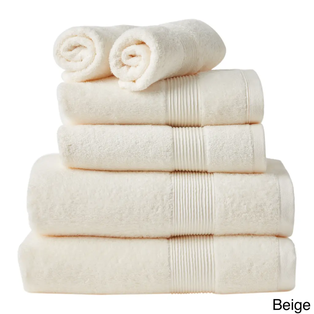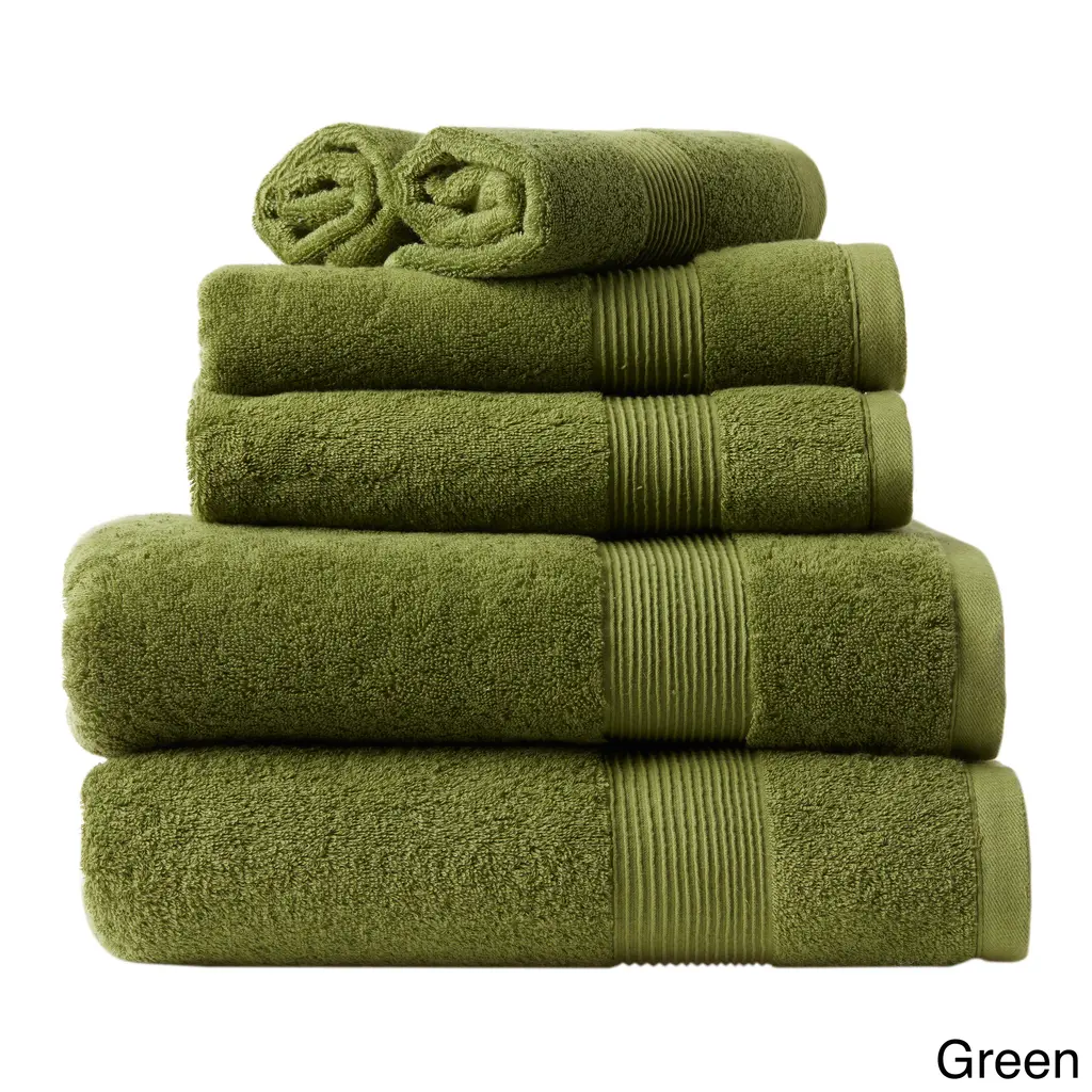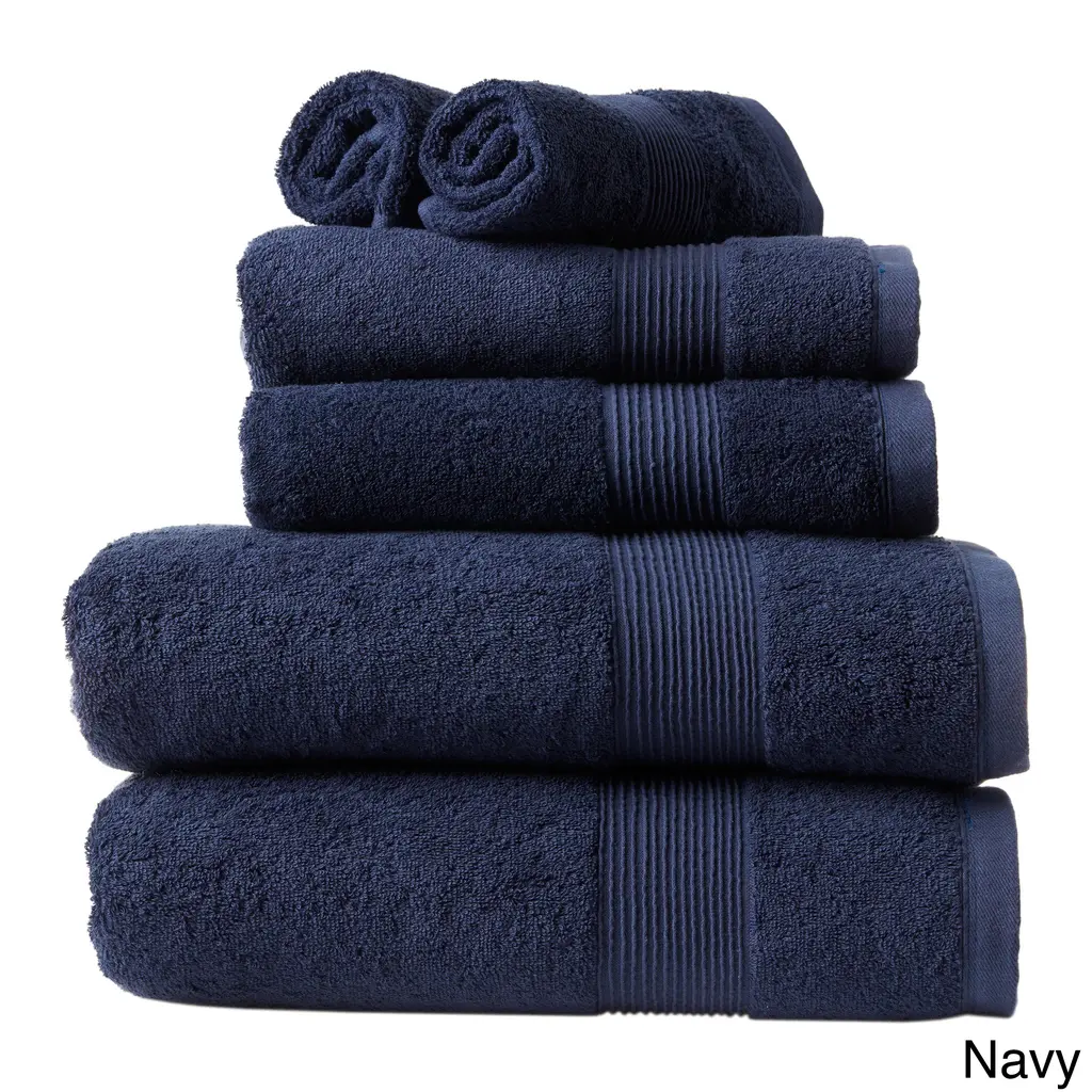 Crafted from cotton for comfort and style, this Soft Touch six-piece towel set will give your bathroom a chic update. The set includes two bath towels, two hand towels, and two washcloths, each accented with a row of textured stripes. The machine washable towels are available in a variety of trendy colors to coordinate with your bathroom decor. Features:Includes 2 bath towels, 2 hand towels and 2 washclothsMade form cottonSolid color patternMachine washableAvailable in white, blue, navy, green, beige, or brown Dimensions:Bath towel: 30 inches wide x 54 inches longHand towel: 20 inches wide x 30 inches longWashcloth: 12 inches wide x 12 inches long