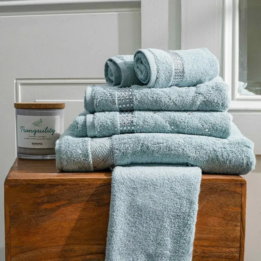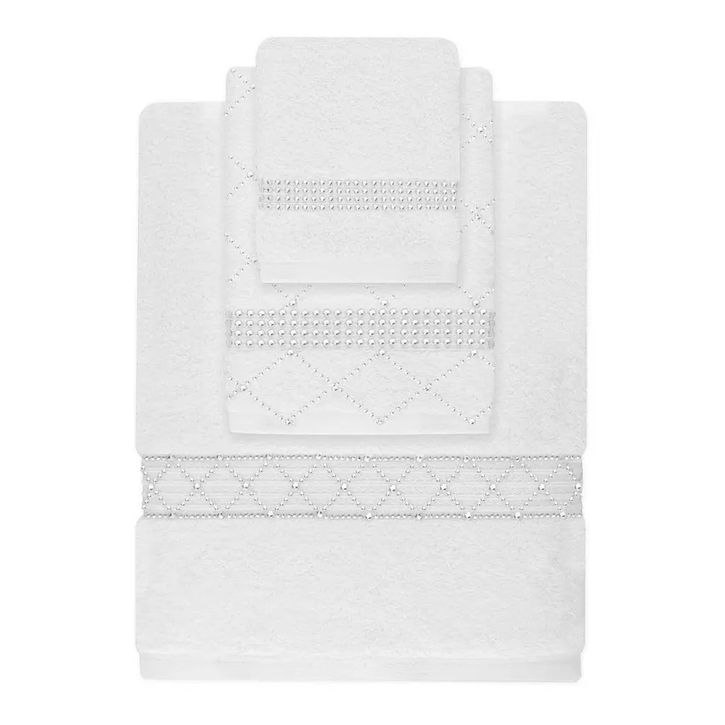 Our Altas 3-Piece Towel Set puts a stylish spin on traditional bath towels. Featuring glistening rhinestones that form a chic X design, these towels are a luxurious addition to your daily routine.These towels not only exude opulence but are also built to withstand regular use. The durable cotton terry material ensures that they maintain their plushness and absorbency over time.Featuring genuine glass rhinestones, the towels catch the light and shimmer with every movement. Choose from a palette of eight vibrant colors, allowing you to match or contrast with your existing decor.The set includes a fingertip towel measuring 12" x 18", a hand towel measuring 16" x 30", and a bath towel measuring 30" x 52", each with a unique design that adds a touch of modernity to the classic towel set.Machine-washable, these towels are easy to keep clean. Just wash on a delicate cycle and then lay them out to dry.