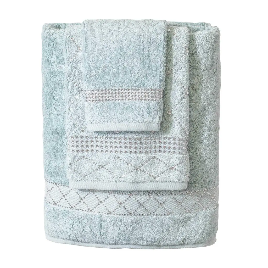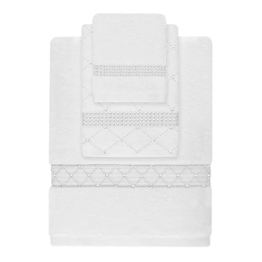 Our Altas 3-Piece Towel Set puts a stylish spin on traditional bath towels. Featuring glistening rhinestones that form a chic X design, these towels are a luxurious addition to your daily routine.These towels not only exude opulence but are also built to withstand regular use. The durable cotton terry material ensures that they maintain their plushness and absorbency over time.Featuring genuine glass rhinestones, the towels catch the light and shimmer with every movement. Choose from a palette of eight vibrant colors, allowing you to match or contrast with your existing decor.The set includes a fingertip towel measuring 12" x 18", a hand towel measuring 16" x 30", and a bath towel measuring 30" x 52", each with a unique design that adds a touch of modernity to the classic towel set.Machine-washable, these towels are easy to keep clean. Just wash on a delicate cycle and then lay them out to dry.