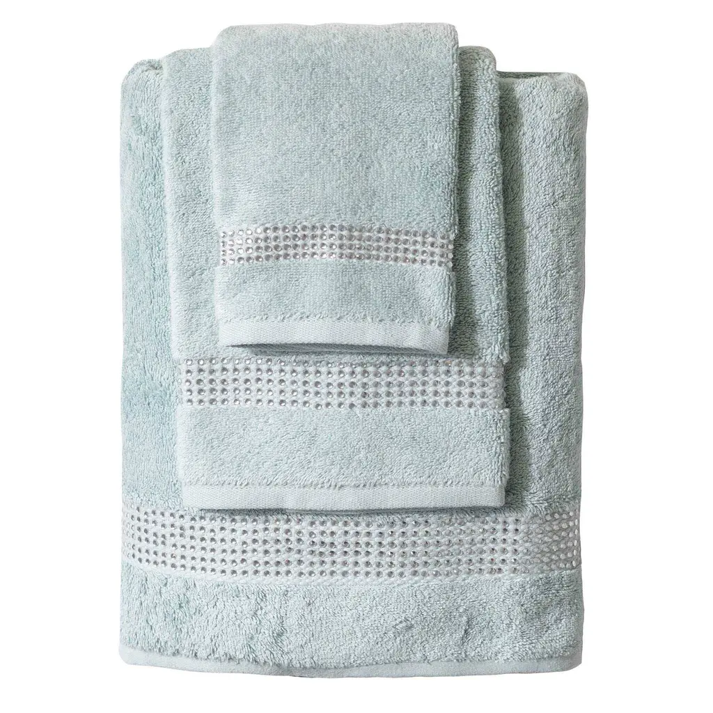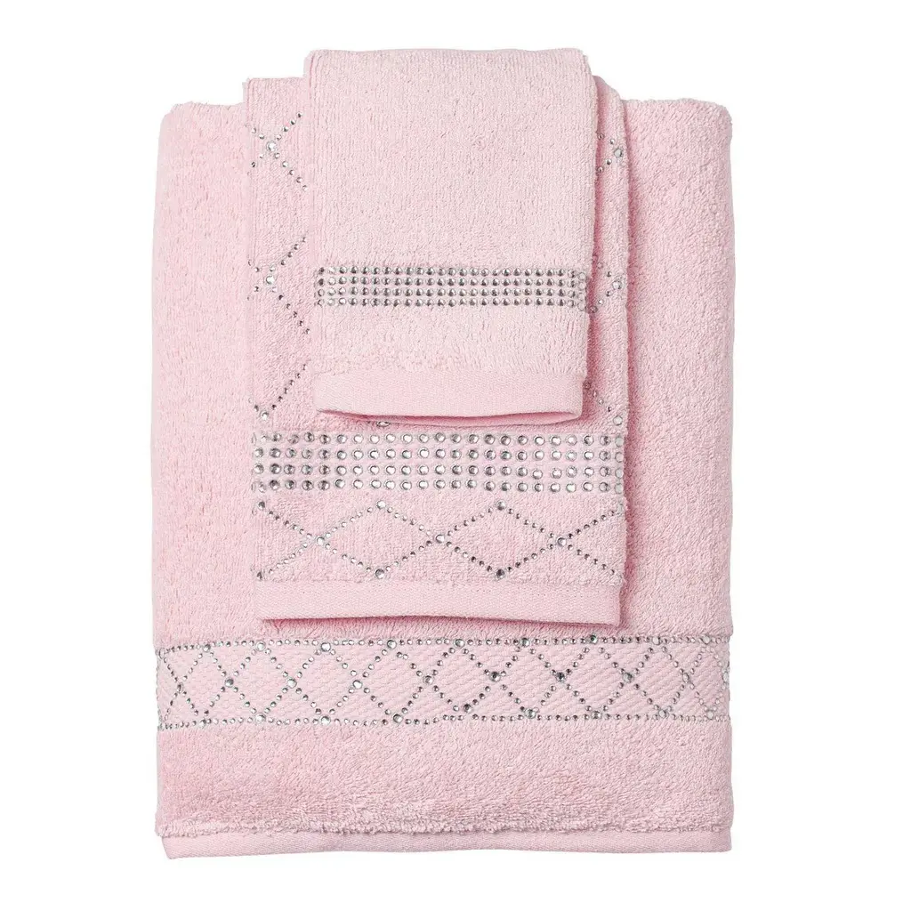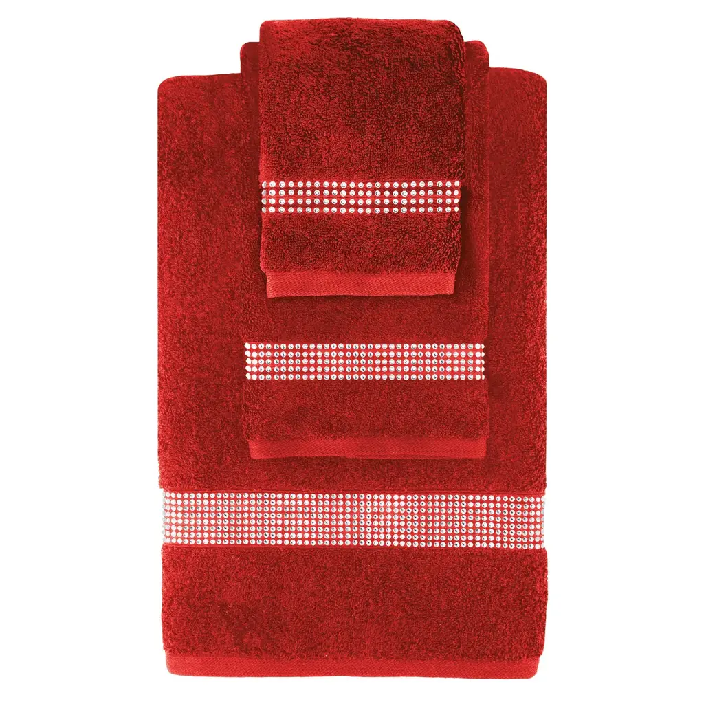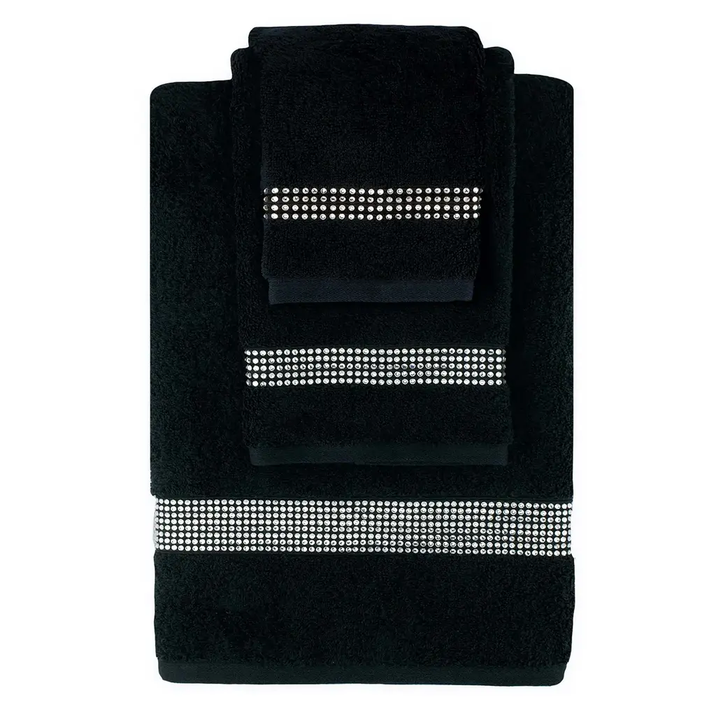 Give your bathroom an instant makeover with our elegant Stripe 3-Piece Towel Set. Each towel features a beautiful rhinestone stripe, adding a glamorous accent. Say goodbye to old and outdated towels and hello to luxury and sophistication.Made from durable, 100% cotton terry, this towel set comes with a glass rhinestone applique set elegantly on each towel for extra sparkle.The set includes a fingertip towel measuring 12" x 18", a hand towel measuring 16" x 30", and a bath towel measuring 30" x 52". Choose from a variety of colors to match your bathroom decor and add instant glam to your space.Machine-washable, maintaining this towel set is as simple as putting them in a garment bag on a delicate wash cycle, and laying flat to dry.