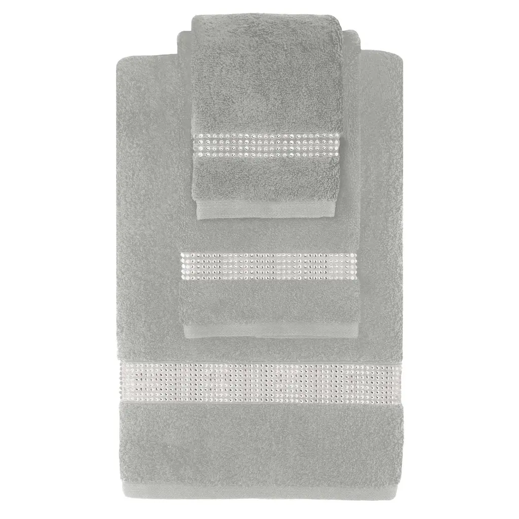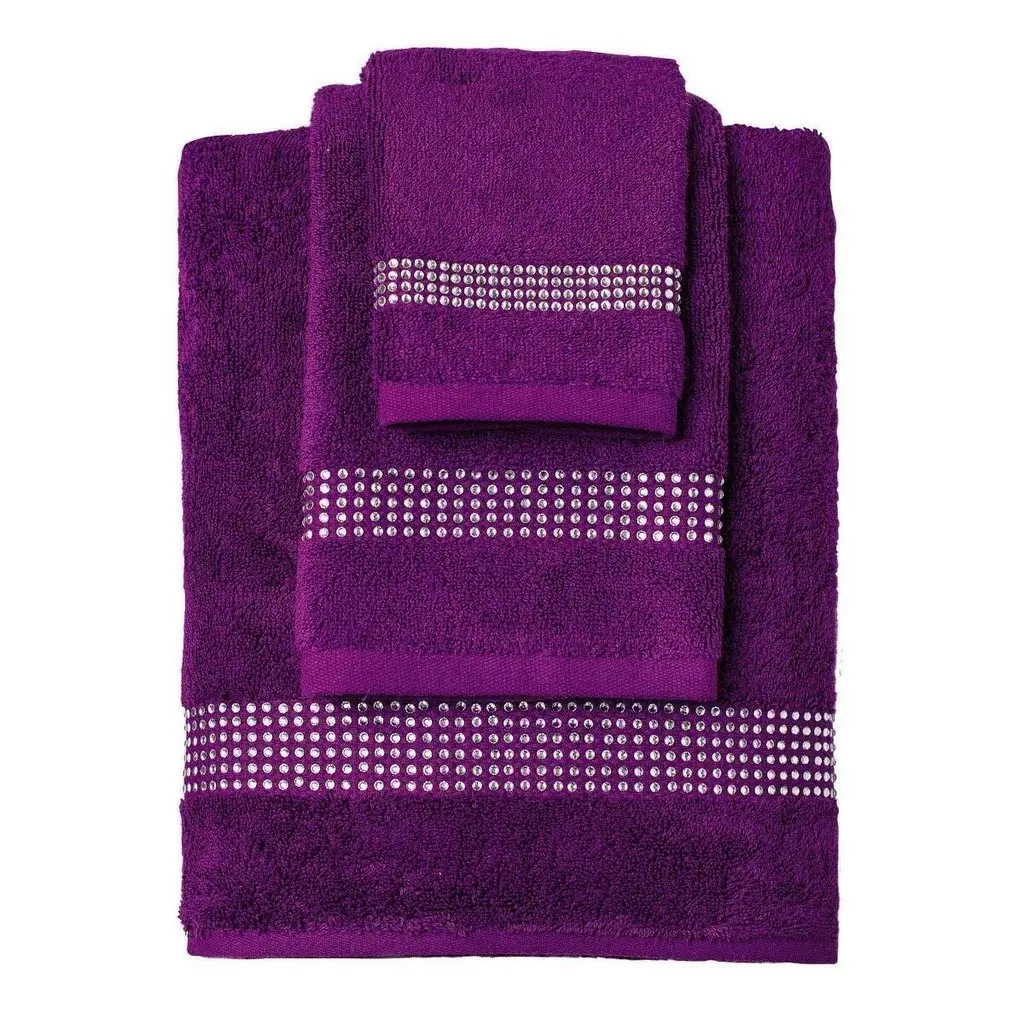 Give your bathroom an instant makeover with our elegant Stripe 3-Piece Towel Set. Each towel features a beautiful rhinestone stripe, adding a glamorous accent. Say goodbye to old and outdated towels and hello to luxury and sophistication.Made from durable, 100% cotton terry, this towel set comes with a glass rhinestone applique set elegantly on each towel for extra sparkle.The set includes a fingertip towel measuring 12" x 18", a hand towel measuring 16" x 30", and a bath towel measuring 30" x 52". Choose from a variety of colors to match your bathroom decor and add instant glam to your space.Machine-washable, maintaining this towel set is as simple as putting them in a garment bag on a delicate wash cycle, and laying flat to dry.