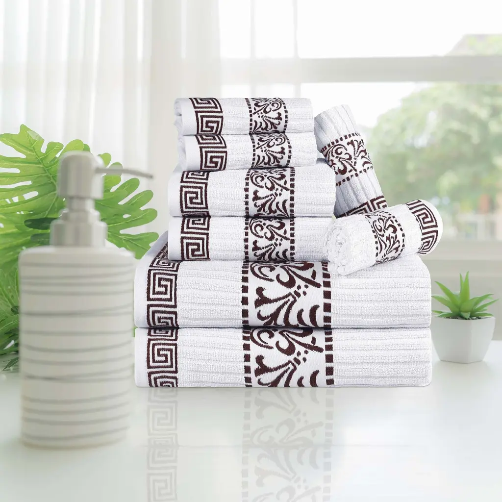 Easily redecorate your bathroom with the Superior Athens Cotton 8-Piece Towel Set. The length and strength of our cotton make each towel in this set naturally strong and soft, with an ultra-absorbent design to keep you warm and dry. For comfort and durability, the 2-ply thickness of each towel provides versatile absorption. These enchanting towels are available in a variety of colors to match your unique bathroom decor style. Pamper yourself while giving a traditional flourish to any master bath, powder room, or guest bathroom.Features:Dimensions:
