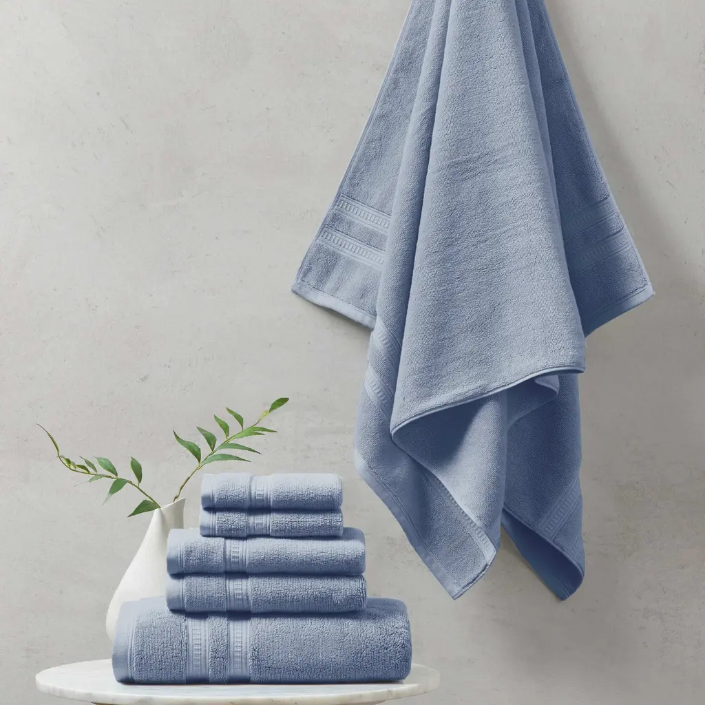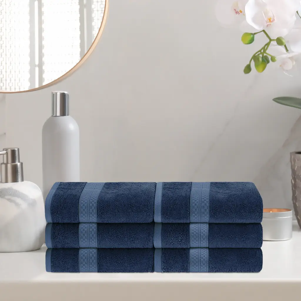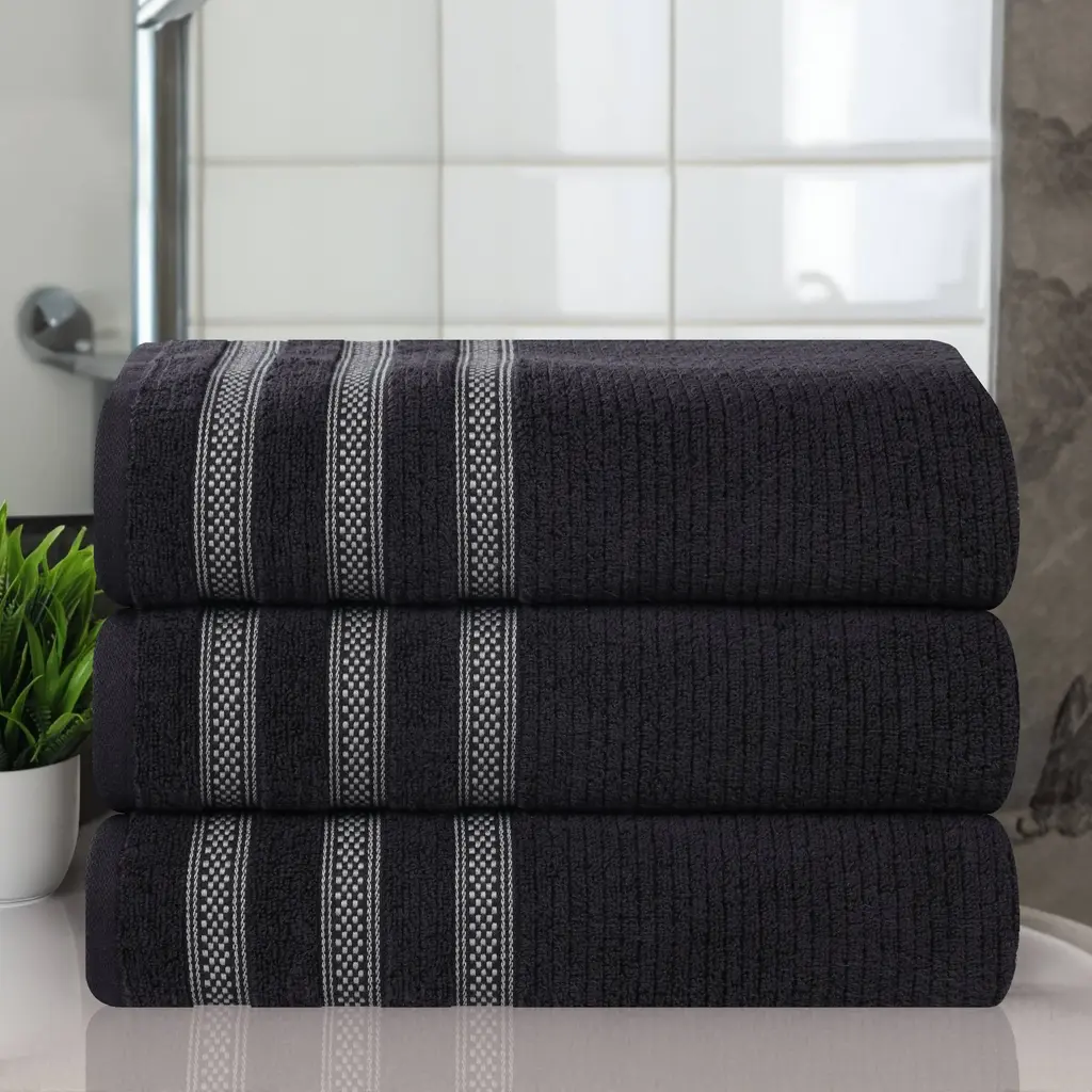 Elevate your bathroom style with the indulgent Superior Brea Zero Twist Cotton Ribbed Modern Bath Towel Set. Our zero twist cotton towels are luxuriously soft and plush with a smooth design, ideal for people with sensitive skin. The comfortable single-ply thickness of each towel provides versatile absorption, perfect for the bath, poolside, or at the beach. Featuring an absorbent ribbed texture with a stylish geometric border, these elegant towels are available in Gold, Rust, Stone, Black, White, Ivory, Grey, Forest Green, and navy blue color options to match your bathroom decor style. This towel set includes; 3 bath towels to complete your bathroom collection. Features: