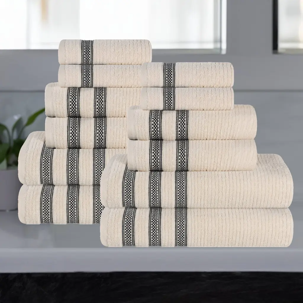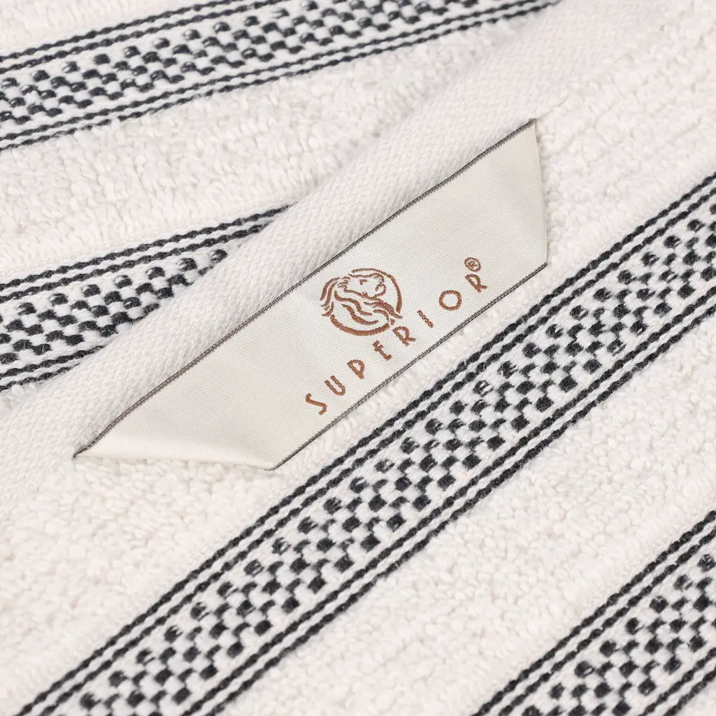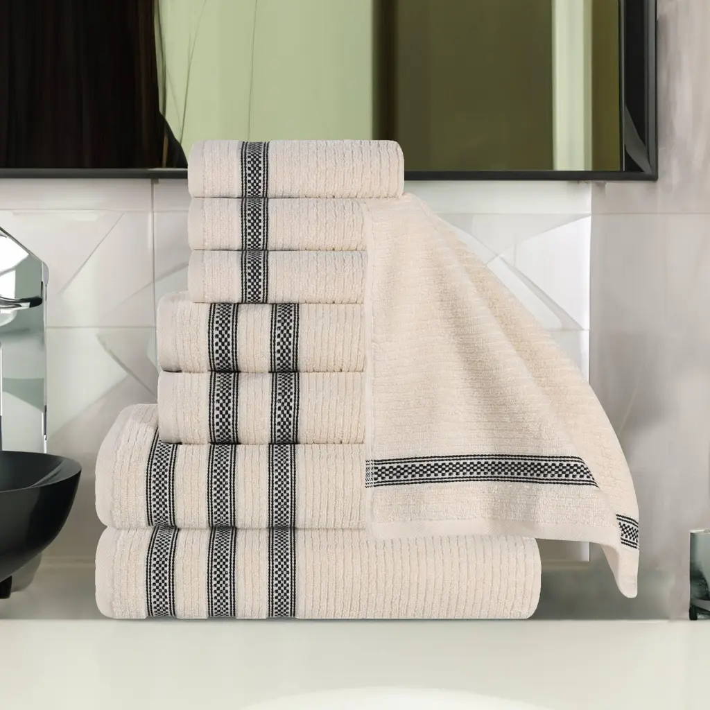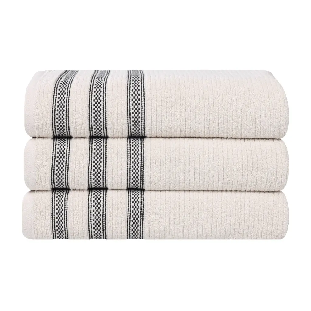 Elevate your bathroom style with the indulgent Superior Brea Zero Twist Cotton Ribbed Modern Bath Towel Set. Our zero twist cotton towels are luxuriously soft and plush with a smooth design, ideal for people with sensitive skin. The comfortable single-ply thickness of each towel provides versatile absorption, perfect for the bath, poolside, or at the beach. Featuring an absorbent ribbed texture with a stylish geometric border, these elegant towels are available in Gold, Rust, Stone, Black, White, Ivory, Grey, Forest Green, and navy blue color options to match your bathroom decor style. This towel set includes; 3 bath towels to complete your bathroom collection. Features: