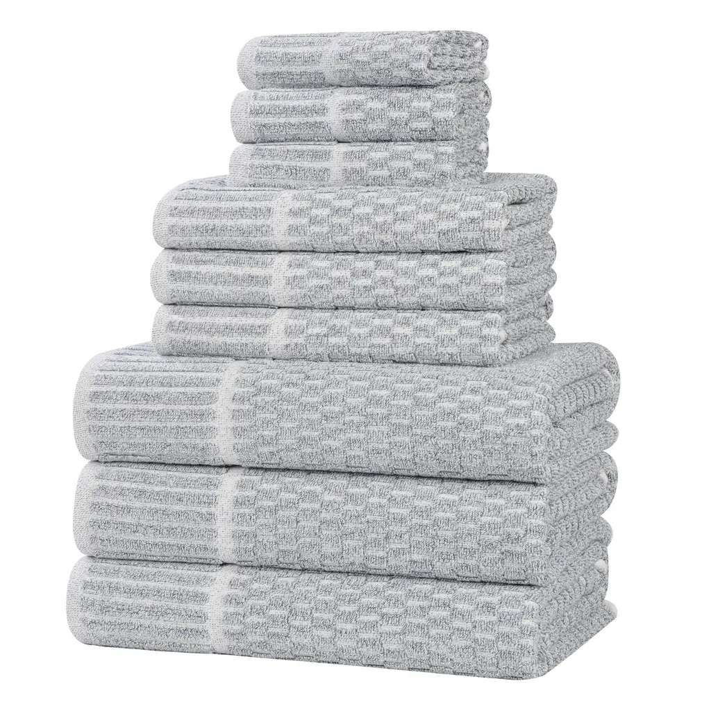 Experience the ultimate in comfort with the Superior Juno Viscose Cotton Blend 9 Piece Towel Set. Crafted from 80% cotton and 20% viscose, these towels offer exceptional softness, absorbency, and a unique aesthetic. The classic stripes combined with a playful checkered border create an eye-catching design that elevates any bathroom. Available in a diverse palette of elegant colors, this set allows you to personalize your space with style. With a soft medium towel weight, these towels are durable and quick drying. Let these towels transform your space into a serene haven of style and functionality.Features:Dimensions:
