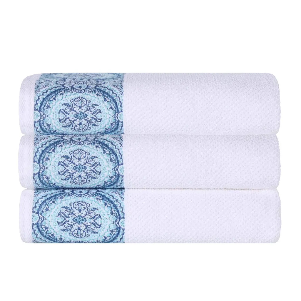 Experience the irresistible comfort of the Superior Medallion Cotton Jacquard Bath Towel Set after you step out of the shower or bath. The naturally soft cotton material has a spa-like texture and soaks up moisture fast. Each towel is highly absorbent and has a medium weight to help you dry quickly. Displaying a textured white pattern with a gorgeous colored medallion border, these towels will seamlessly elevate the mood of your space.Features: