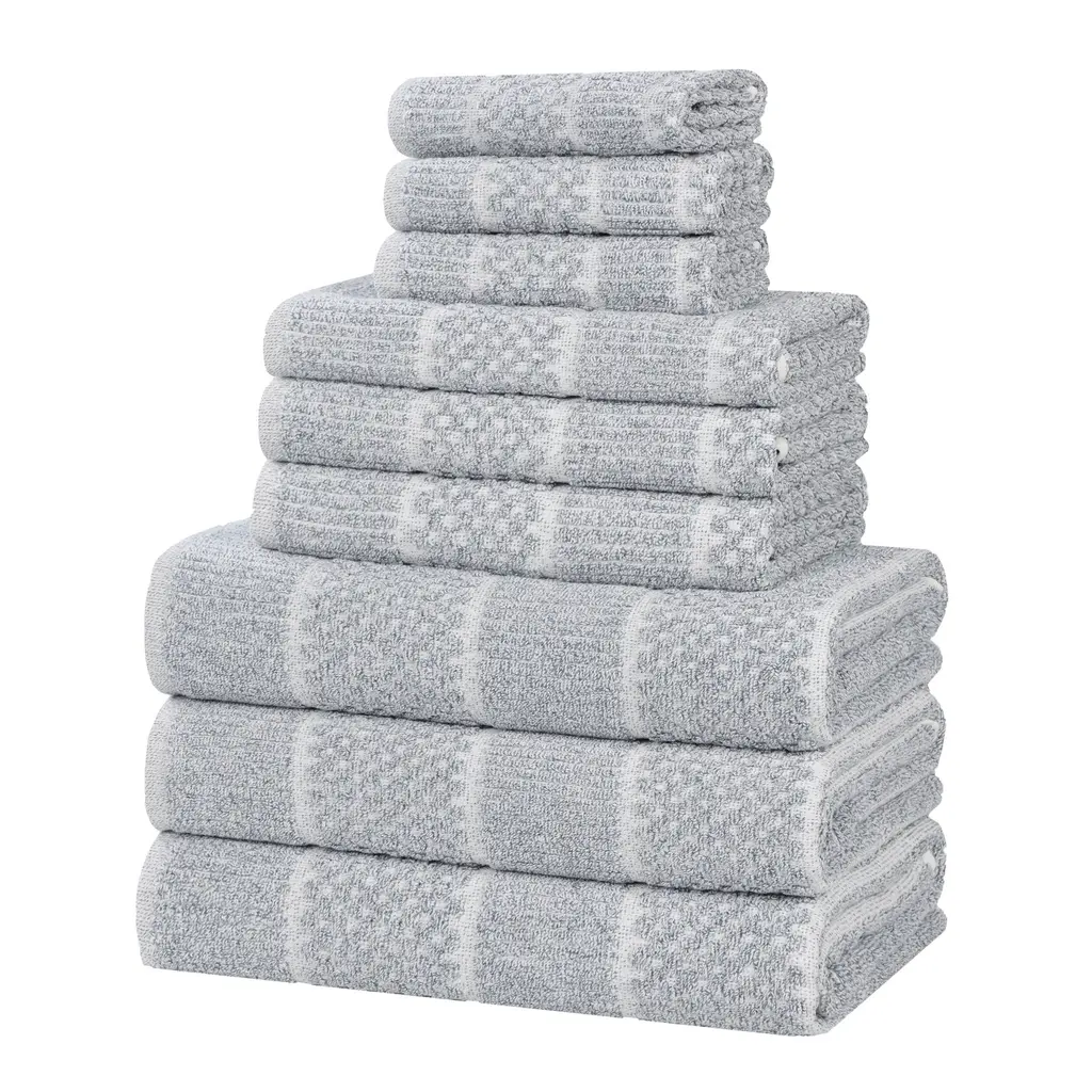 Indulge in everyday luxury with the Superior Naples Viscose Cotton Blend 9 Piece Towel Set. Crafted from 80% cotton and 20% viscose, these towels provide exceptional softness and absorbency while showcasing a unique aesthetic. The alternating checkered and ribbed design adds an eye-catching element that elevates any bathroom. Available in a diverse palette of elegant colors, this set allows you to personalize your space with style. With a soft medium towel weight, these towels are durable and quick drying. Let them transform your bathroom into a serene haven of style and functionality. Features: Dimensions: