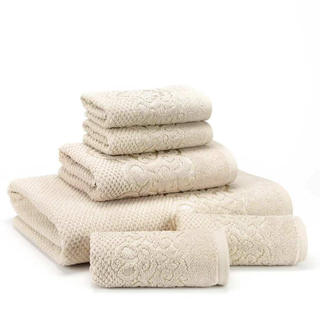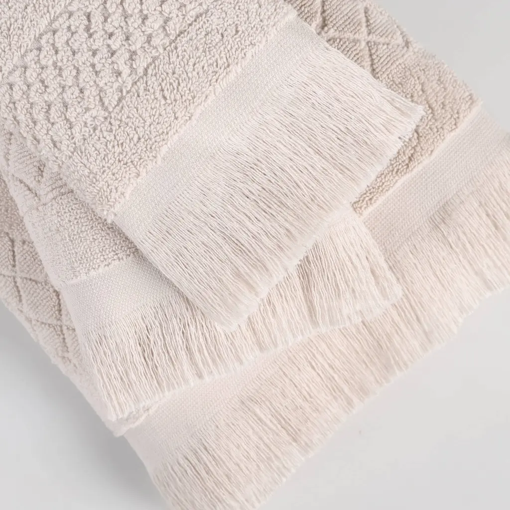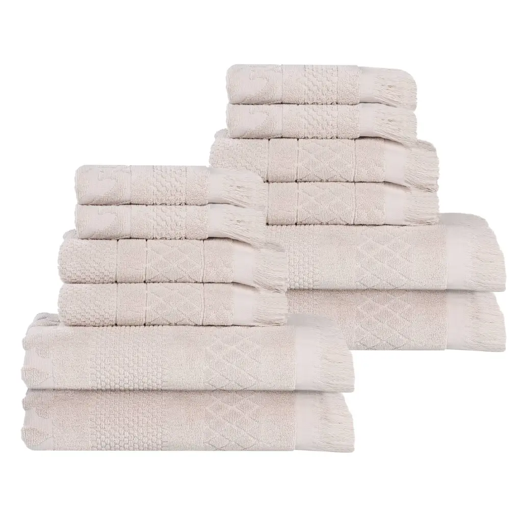Restock your bathroom linen with the practical and stylish Superior Rolla Cotton Geometric 12 Piece Towel Set. Our fluffy cotton towels have a luxuriously soft feel and are naturally eco-friendly, ideal for people with sensitive skin. Featuring a unique geometric design with frayed edges, enjoy the absorbent feeling of these towels after every wash. The medium weight thickness of each towel is versatile and perfect for the bath, poolside, or at the beach. These towels are available in Sage, Peach, Chocolate, Silver, White, Ivory, Blue, Black, and Grey color options to match your bathroom decor style. This assorted bathroom towel set includes; 4 face towels, 4 hand towels, and 4 bath towels.Features:Dimensions: