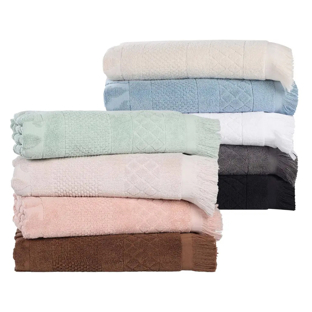 Give your master bath, powder room, or guest bathroom a quick update with the Superior Rolla Cotton Geometric 3 Piece Towel Set. Our fluffy cotton towels have a luxuriously soft feel and are naturally eco-friendly, ideal for people with sensitive skin. Featuring a unique geometric design with frayed edges, enjoy the absorbent feeling of these towels after every wash. The medium weight thickness of each towel is versatile and perfect for the bath, poolside, or at the beach. These towels are available in Sage, Peach, Chocolate, Silver, White, Ivory, Blue, Black, and Grey color options to match your bathroom decor style. Features: Dimensions: