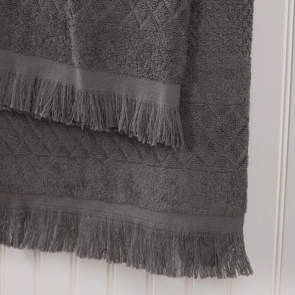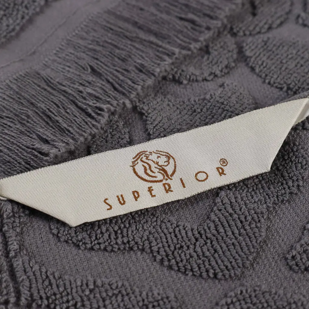 Give your master bath, powder room, or guest bathroom a quick update with the Superior Rolla Cotton Geometric 3 Piece Towel Set. Our fluffy cotton towels have a luxuriously soft feel and are naturally eco-friendly, ideal for people with sensitive skin. Featuring a unique geometric design with frayed edges, enjoy the absorbent feeling of these towels after every wash. The medium weight thickness of each towel is versatile and perfect for the bath, poolside, or at the beach. These towels are available in Sage, Peach, Chocolate, Silver, White, Ivory, Blue, Black, and Grey color options to match your bathroom decor style. Features: Dimensions: