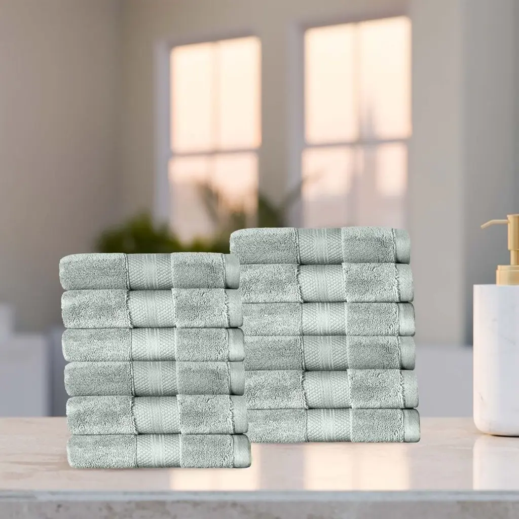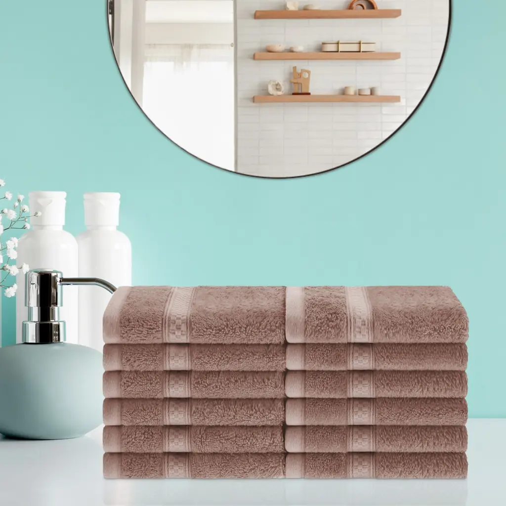 Add spa-like luxury to your bathroom accessories with the Superior Rolla Cotton Geometric Hand Towel Set. Our fluffy cotton towels have a luxuriously soft feel and versatile absorption, perfect for cleaning up spills or to effortlessly dry your hands off. Featuring a unique geometric design with frayed edges, enjoy the absorbent feeling of these towels after every wash. These towels are available in Sage, Peach, Chocolate, Silver, White, Ivory, Blue, Black, and Grey color options to match your bathroom decor style. For comfort and durability, each towel has a medium weight thickness. This set of daily essentials includes 6 hand towels to easily stock your bathroom or kitchen.Features: