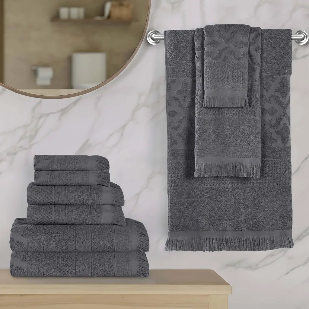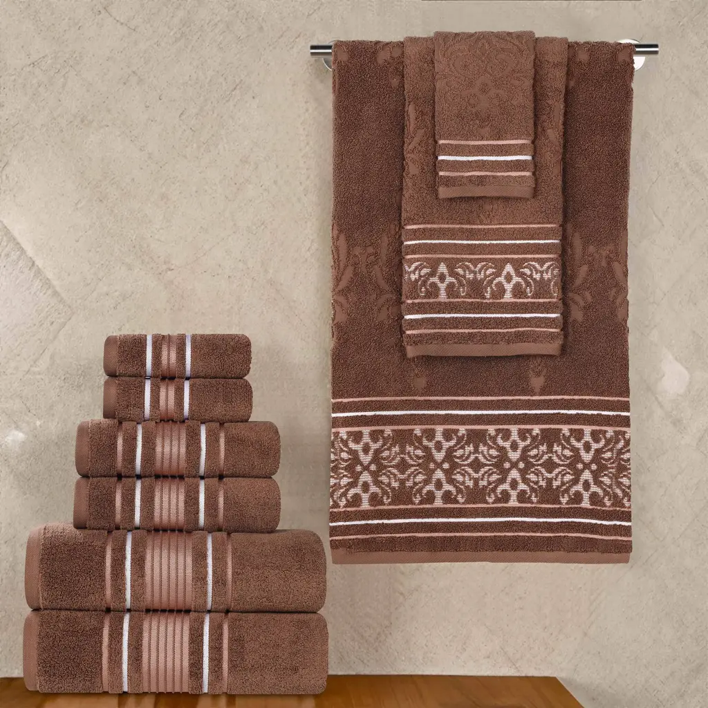 Perfectly coordinate your bathroom look with the Superior Sadie Zero Twist Cotton Solid and Floral 9 Piece Towel Set. Our fluffy cotton towels have a luxuriously soft feel and the zero twist weave is plush, and highly-absorbent to get you dry quickly. The medium weight thickness of each towel is versatile and perfect for the bath, poolside, or at the beach. For added style, each piece in this bundle features both an elegant floral jacquard pattern and solid pattern with a hanging loop for effortless drying. These towels are available in Gold, Forest Green, Charcoal, Chocolate, White, Ivory, Platinum, Navy Blue, and stone color options to match your bathroom decor style. This set includes 3 face towel/ washcloths, 3 hand towels, and 3 bath towels to complete your bathroom essentials.Features:Dimensions: