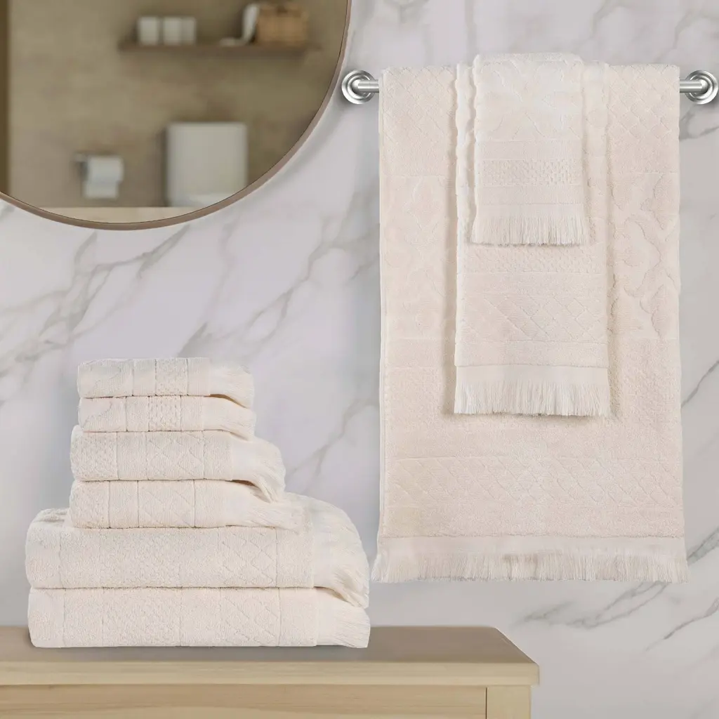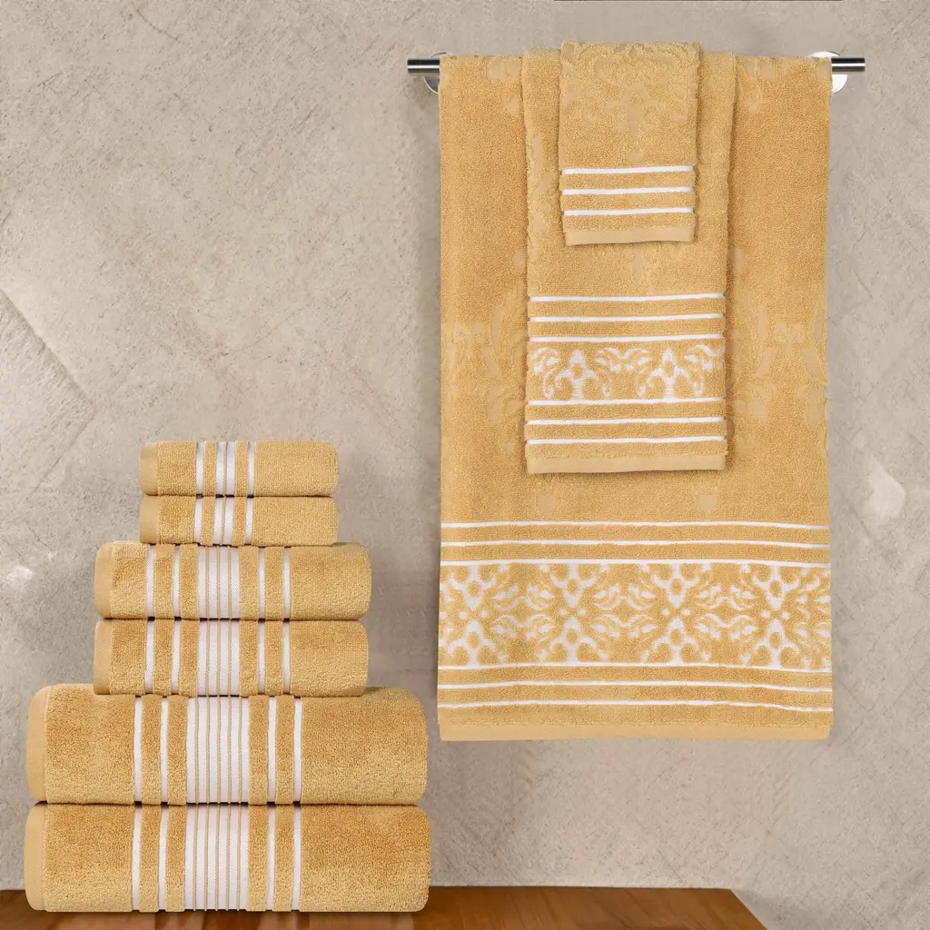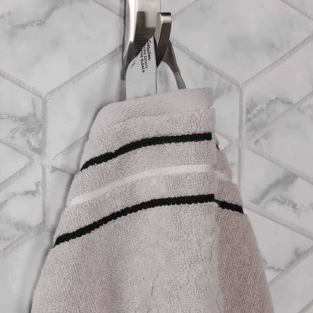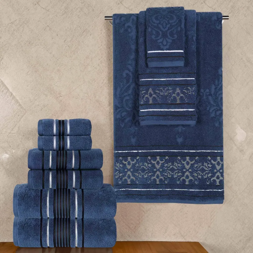 Perfectly coordinate your bathroom look with the Superior Sadie Zero Twist Cotton Solid and Floral 9 Piece Towel Set. Our fluffy cotton towels have a luxuriously soft feel and the zero twist weave is plush, and highly-absorbent to get you dry quickly. The medium weight thickness of each towel is versatile and perfect for the bath, poolside, or at the beach. For added style, each piece in this bundle features both an elegant floral jacquard pattern and solid pattern with a hanging loop for effortless drying. These towels are available in Gold, Forest Green, Charcoal, Chocolate, White, Ivory, Platinum, Navy Blue, and stone color options to match your bathroom decor style. This set includes 3 face towel/ washcloths, 3 hand towels, and 3 bath towels to complete your bathroom essentials.Features:Dimensions: