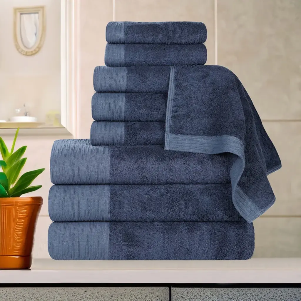 Lend a delightfully fresh look and feel to your bathroom with our Smart Dry Cotton 9-Piece Towel Set. The unique zero twist cotton design of these towels helps you dry faster and provides an elevated bathroom experience. These plush and fluffy bathing essentials will transform how you dry off. Available in a variety of stylish solid colors, you can easily coordinate this set with your existing bathroom decor. Treat yourself while adding a modern flourish to any master bath, powder room, or guest bathroom. Features:Dimensions: