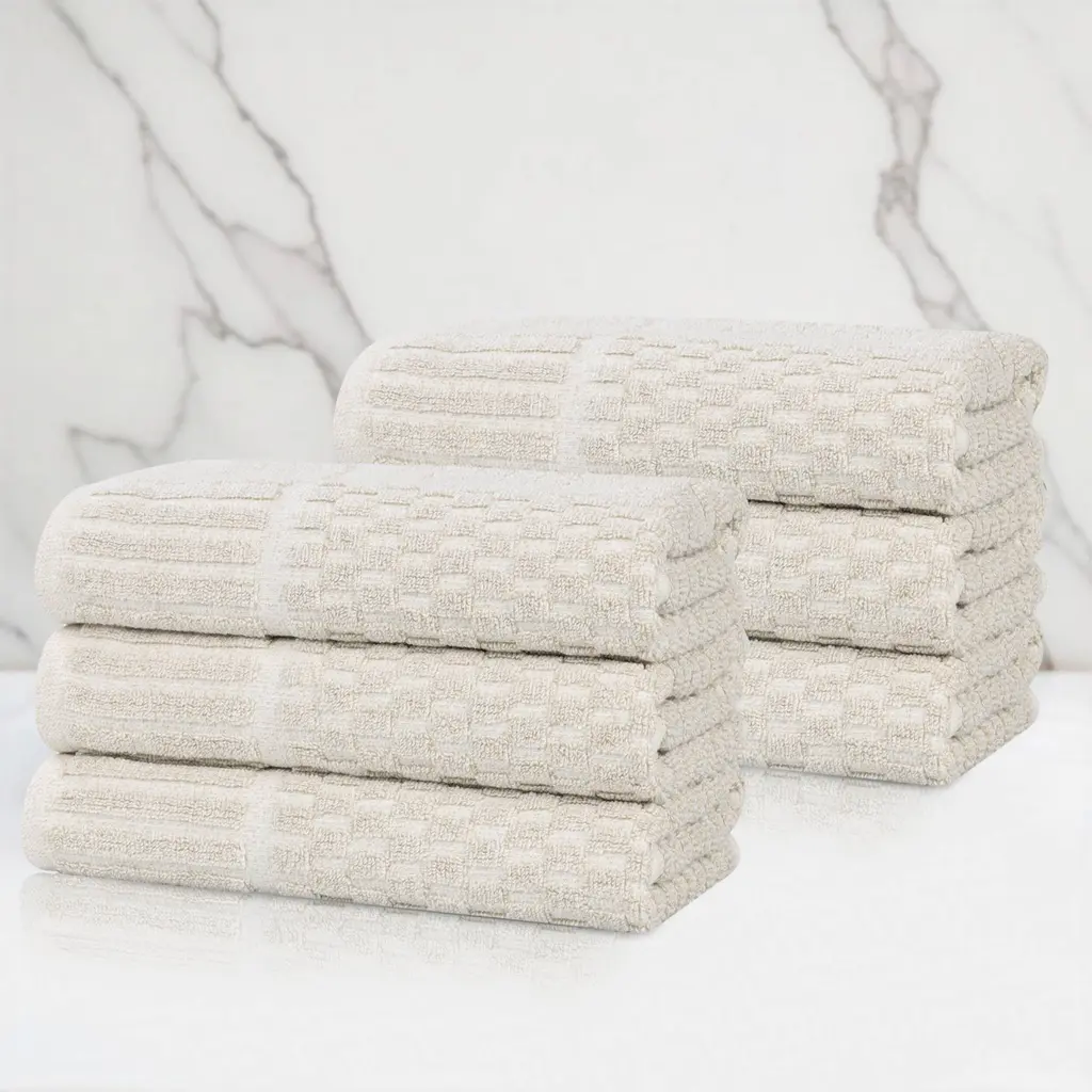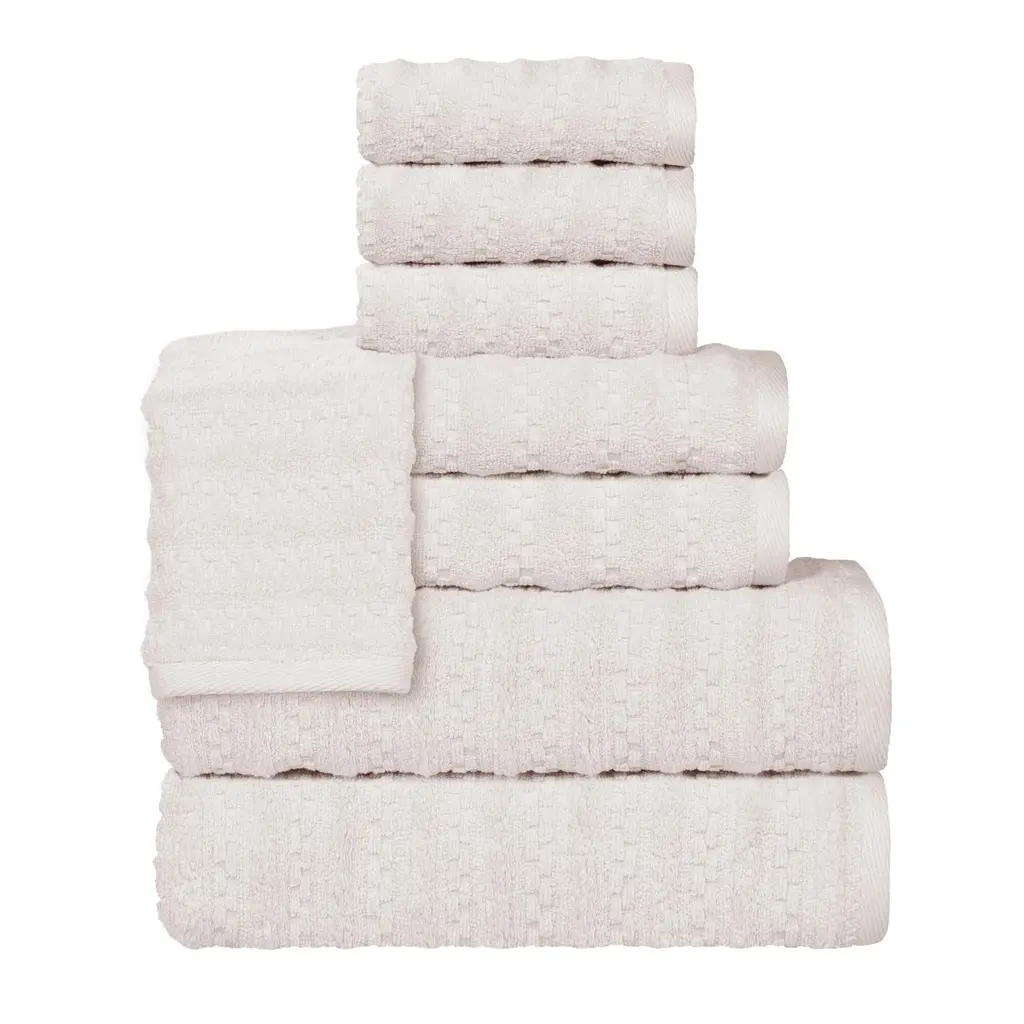 Provide your guests with an unforgettable experience of comfort and luxury with our Zuma 8 Piece Towel Set by Superior. Crafted from 100% premium cotton, these towels are designed to withstand frequent laundering while maintaining their exceptional softness and absorbency. The classic design, accented by subtle waffle textured stripes, complements any decor. The quick-drying nature optimizes efficiency and effortlessly elevates your bathing ritual. Features: Dimensions: