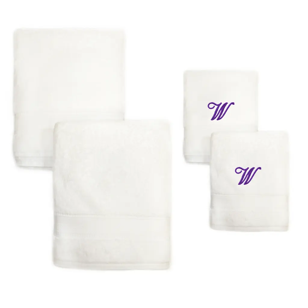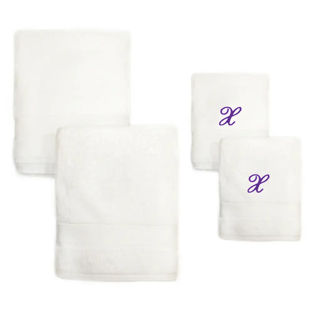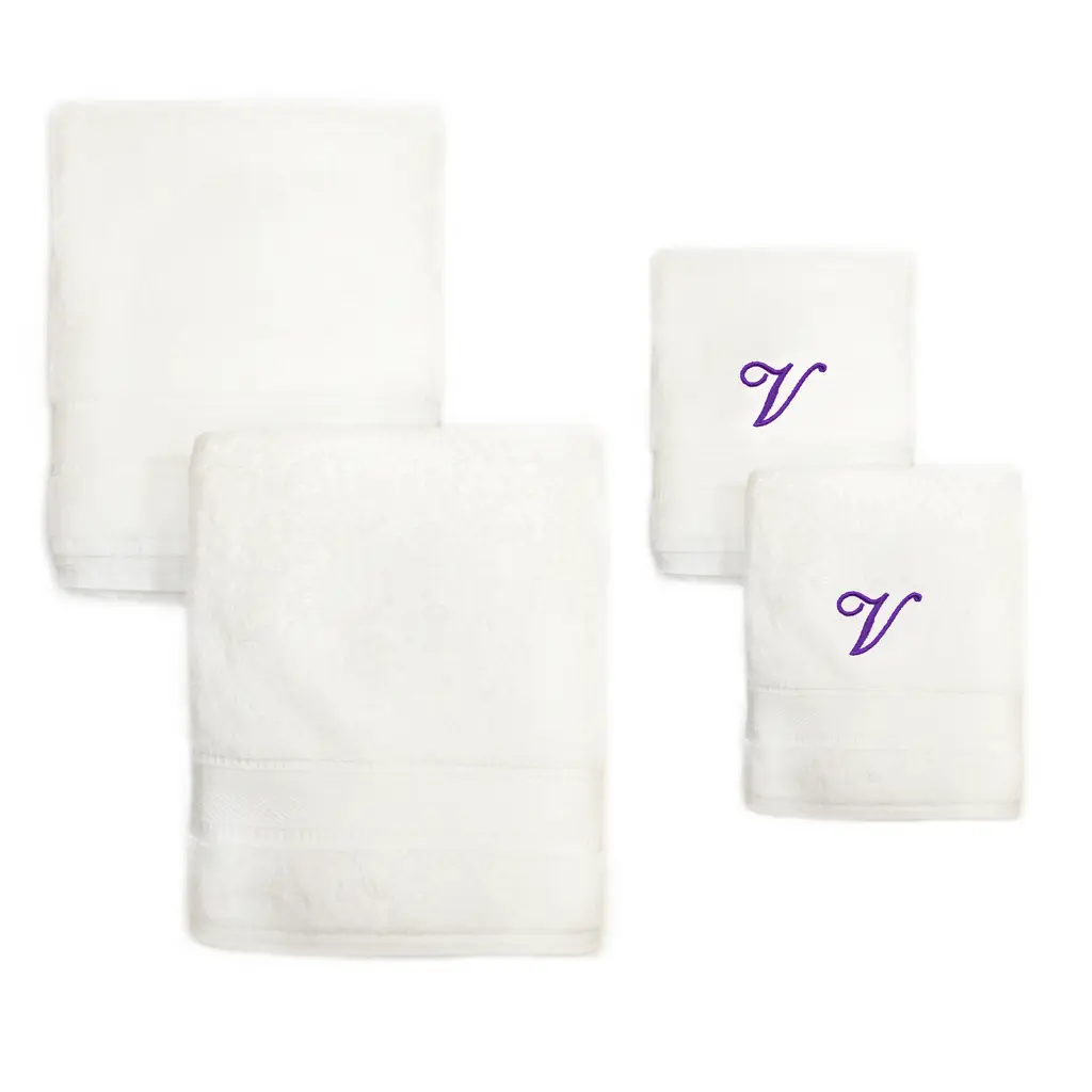 Sweet Kids bath and hand towel set is made from high end, white Turkish cotton with a beautiful lavender purple script embroidered initial of your choice monogrammed on each towel. These 700 gram towels are made especially for kids and become softer and more absorbent with every wash. Your child will love a personalized towel of their very own.Set includes: One (1) hand towel and one (1) bath towelSoft, thick and very absorbentLong-lasting towels designed for heavy useBecome softer with each washWill not pill or shedPattern: White embroidered with the initial of your choice in purple script lettering Type of cotton: TurkishConstruction: Looped terryclothMaterials: 100-percent Turkish cottonCare instructions: Machine washableMade in TurkeyHand towel dimensions: 16 inches x 30 inchesBath towel dimensions: 27 inches x 54 inches Product Features: Monogrammed Material: Turkish Cotton Pattern: Embroidered, Solid Color, Kids Set Include: 2 Piece Care Instruction: Machine Wash Towel: Towel Sets, Bath Towels, Hand Towels Color: White, Purple