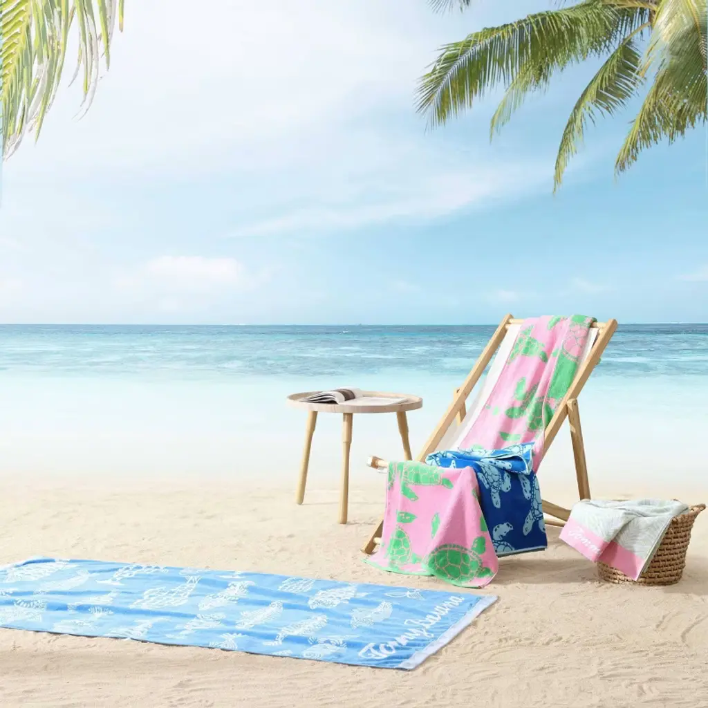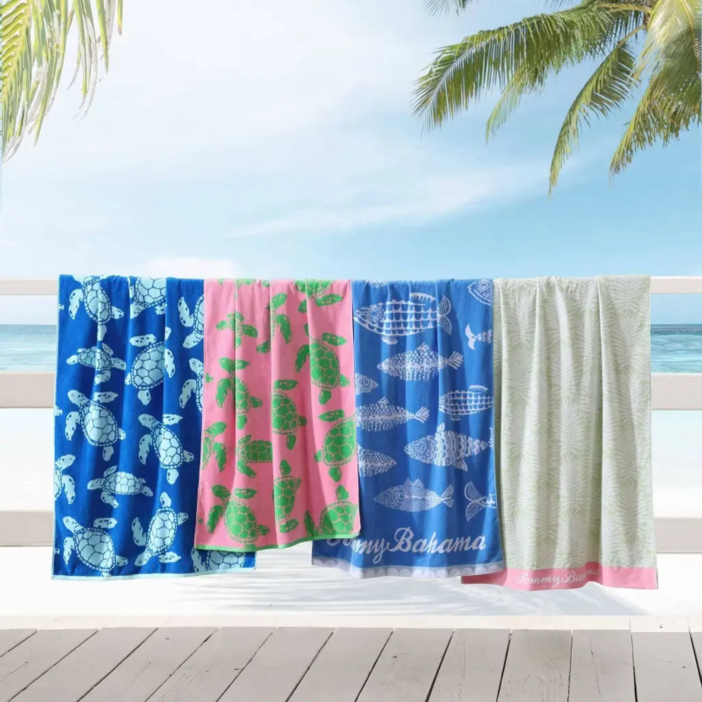 The Tommy Bahama beach towels feature a bold and fun tropical design with a classic Nautical twist. Tommy Bahama beach towels combine both style and practicality, it makes a standout addition to any vacation or sunny day activity. Made from 100% cotton terry, the towel is incredibly soft, highly absorbent, and fade-resistant, ensuring comfort and durability with every use. This beach towel is available in a generously sized dimension of 36" x 72", providing ample coverage. Its large size ensures maximum comfort and relaxation and machine washable for easy care. Our Tommy Bahama beach towels are sure to be the talk of the summer, effortlessly blending style and functionality for all your outdoor adventures.