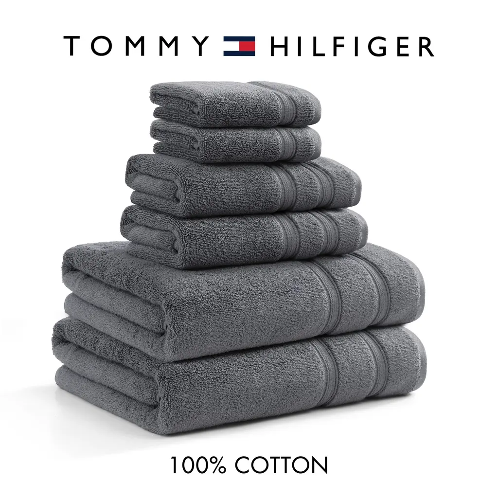 Enhance your bathroom with a touch of luxury with Tommy Hilfiger's Harborside 6-Piece Towel Set. Featuring a refined color palette that effortlessly complements any bathroom décor, this set is accented with the iconic Tommy Hilfiger flag for a signature finish. Crafted from premium cotton, these towels offer a substantial 600 GSM weight and durable zero twist construction for superior softness and quick drying. This set includes 2 bath towels, 2 hand towels, and 2 washcloths, providing all the essentials to elevate your space. Machine washable for easy care, these towels blend luxury with everyday practicality.