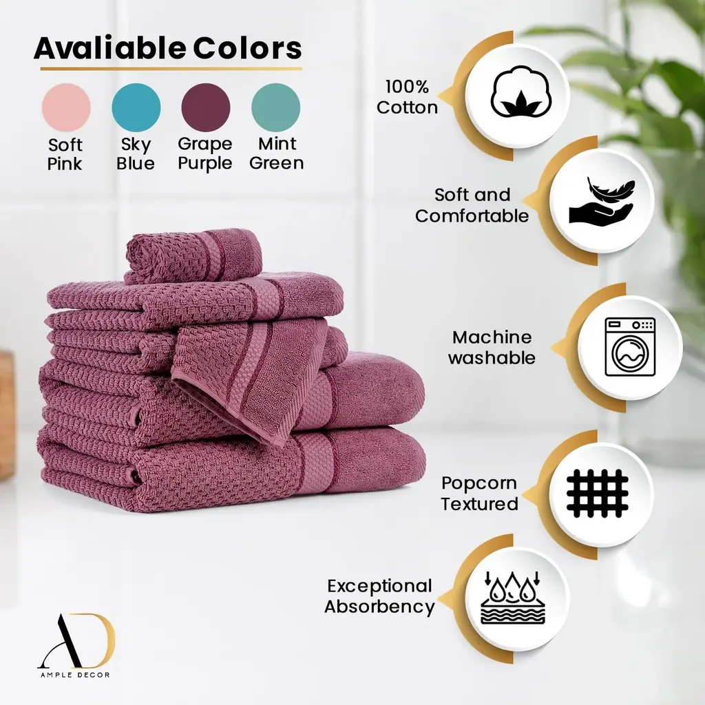 Towel Set Of 6 Cotton Popcorn Textured By Ample Decor - 2Bath, 2Hand, 2Wash - Grape Purple