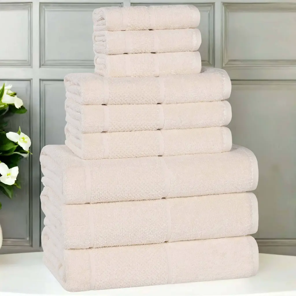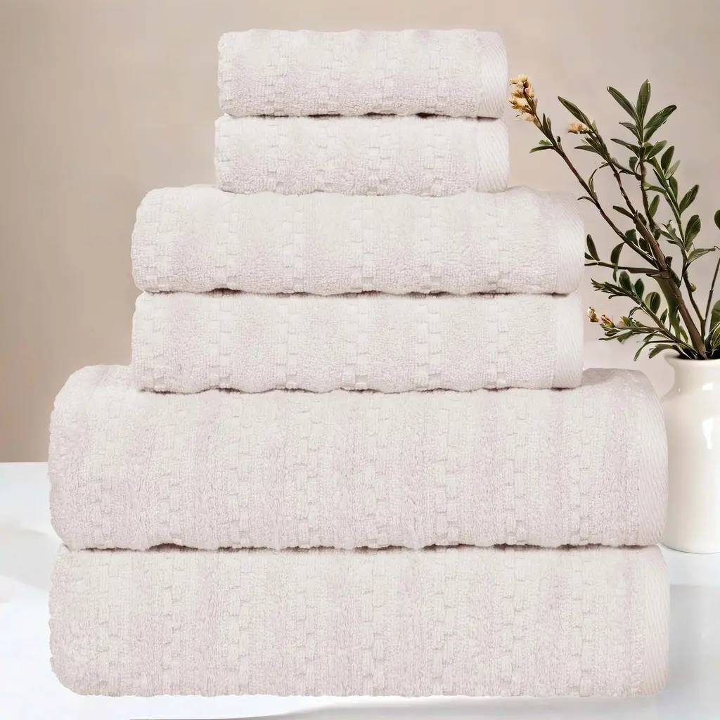 This 6-piece towel set is the perfect blend of luxury and practicality for any bathroom or guest area. The cream-colored towels have a warm feel and are made from 100% cotton, so they're super soft, making your daily routine feel really nice. Enhanced Durability: These towels are made from fade-resistant cotton, so they look fresh after loads of washes while keeping their plushness.Soft and Skin-Friendly: Perfectly comfortable against the skin, each towel gives a fancy feel after bathing or during beauty sessions.Multi-Purpose Usage: Brilliant for all sorts of needs, from cleaning to treating guests, making them handy for home and commercial uses.Breathable Construction: The breathable fabric helps drying quickly, making these towels comfy to use anywhere.Generous Dimensions: With large bath and hand towels sized 27.6x55.1 in and 19.7x39.4 in, they ensure great drying and comfort after every wash.