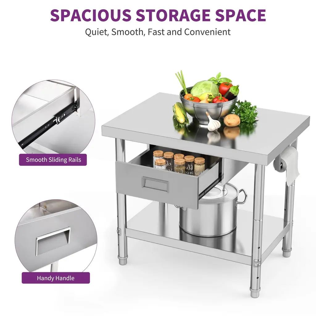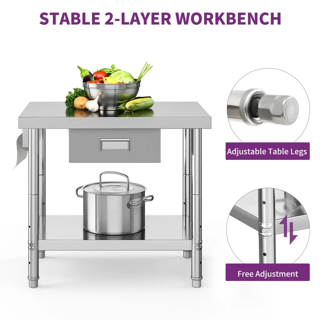 This stainless steel workbench is suitable for the kitchen, garage, workshop, bar, restaurant, laundry room, school, hospital, warehouse and other places that accommodate for the workbench, dinner table, laundry table. With 201 stainless steel table is corrosion-resistant, rust-proof, easy to clean, and has long service life; 0.6MM thickened stainless steel plate with thickened tubes and high-quality accessories provides a total of 840LBS load-bearing. A 2-layer stainless steel workbench can meet your use and storage needs at the same time, it is not only a stage for your talent, but also a storage place for microwave oven, meat grinder and other appliances. This Stainless steel table has a double-layer removable table shelf, providing you with more storage space.