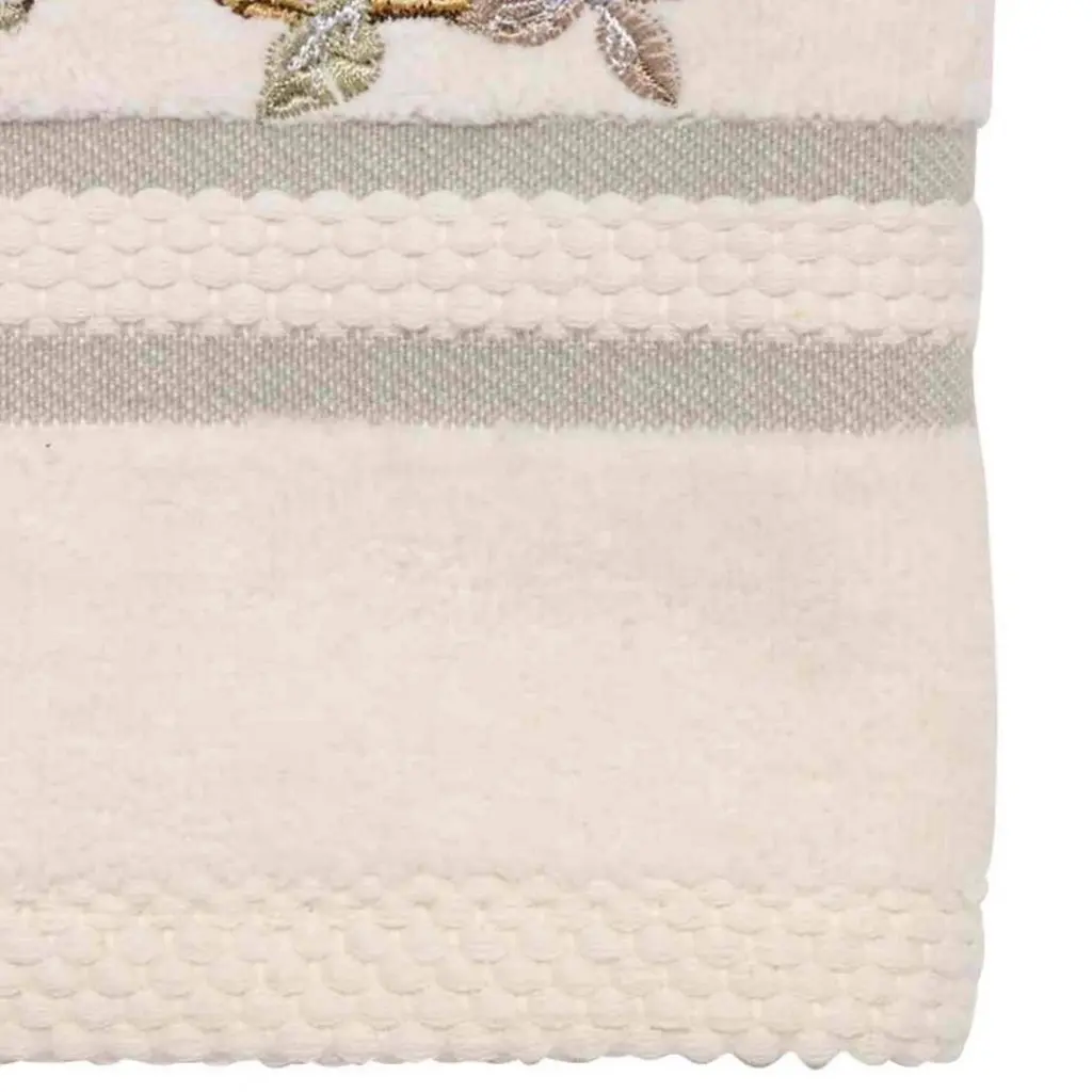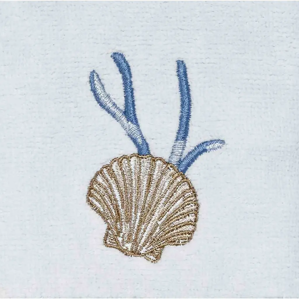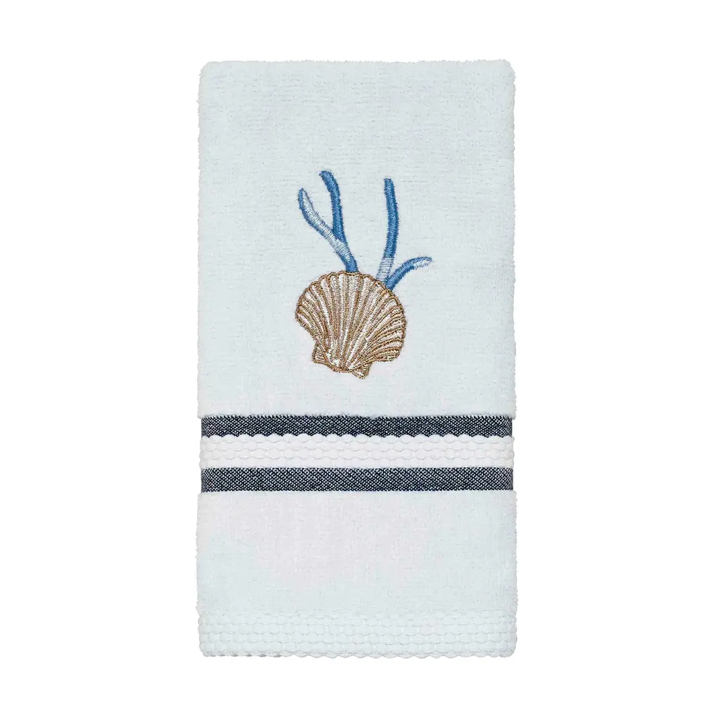 The Avanti Blue Lagoon Fingertip Towel features a beautifully embroidered fan shell and coral in shades of blue and beige on a 100% cotton light grey terry towel. The towel is finished with 2 coordinating navy horizontal stripes. Shower curtain, accessories, towels and rug available.