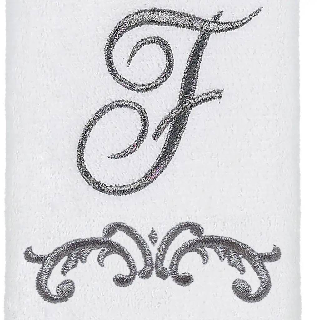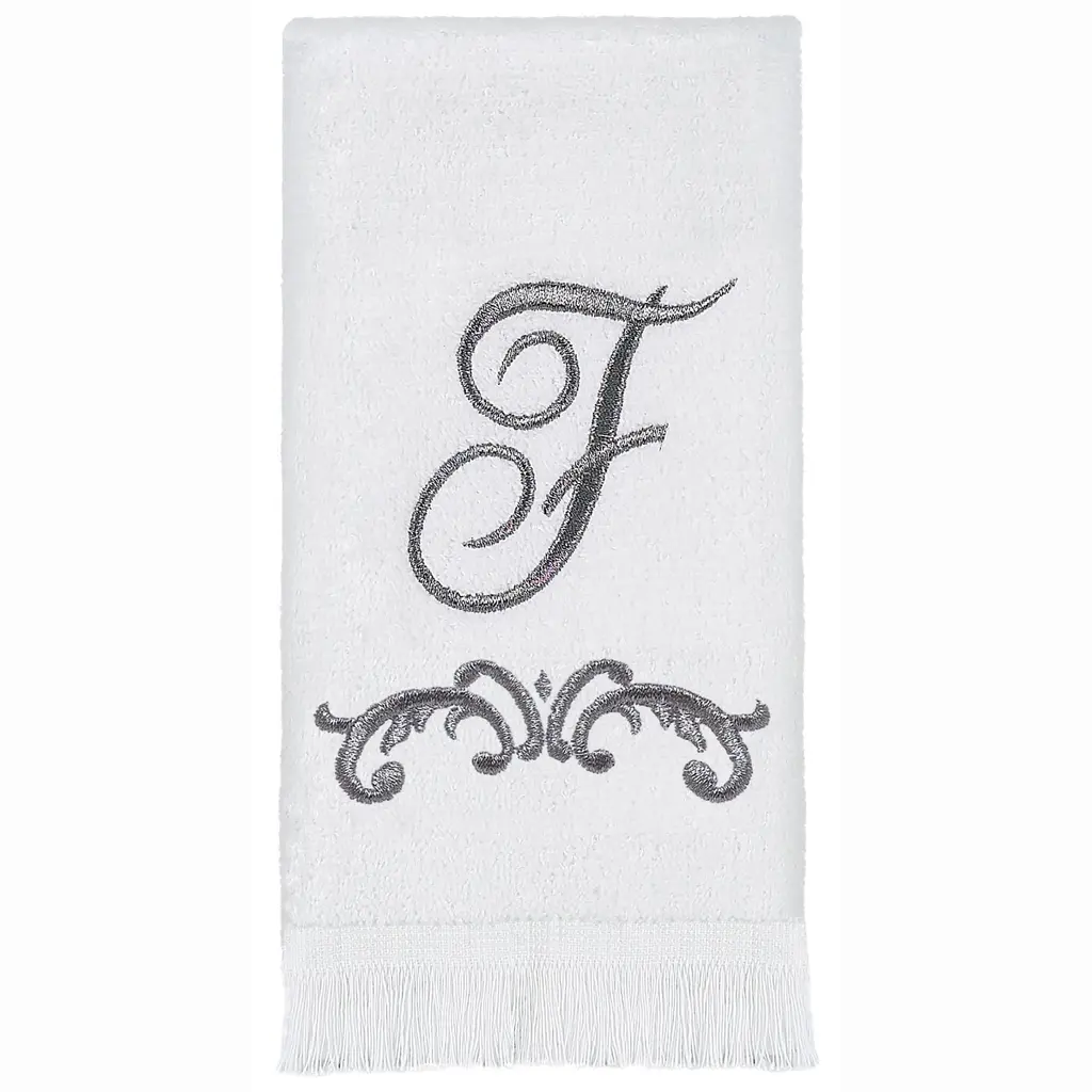 The Avanti Scroll "F" Monogram Fingertip Towel features a stylized script capital letter "F" accompanied by a decorative scroll underneath. The 11" x 18" 100% cotton velour white fringed towel is the perfect background for the metallic pewter design. Available in other letters.