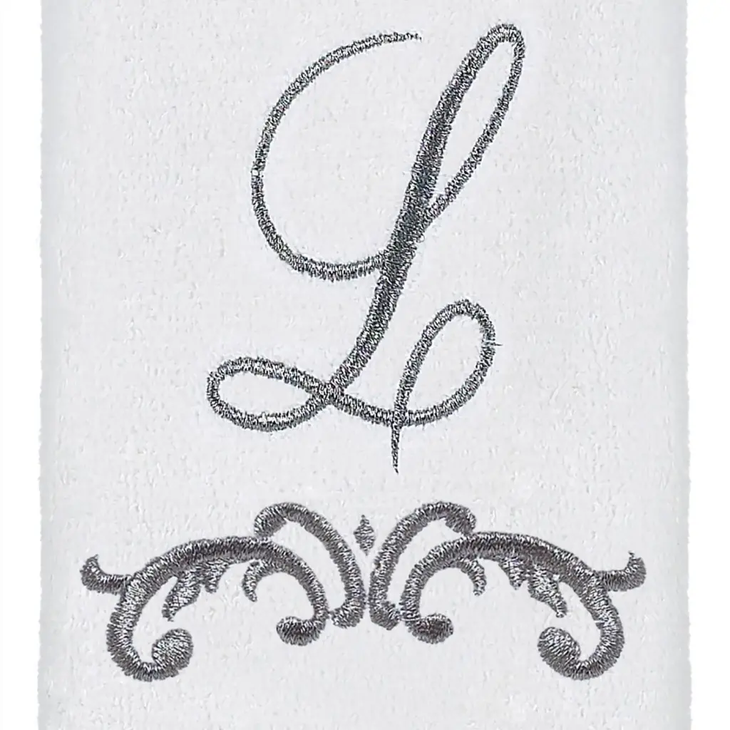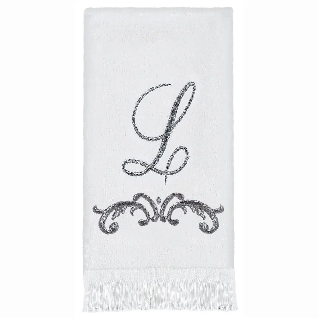The Avanti Scroll "L" Monogram Fingertip Towel features a stylized script capital letter "L" accompanied by a decorative scroll underneath. The 11" x 18" 100% cotton velour white fringed towel is the perfect background for the metallic pewter design. Available in other letters.