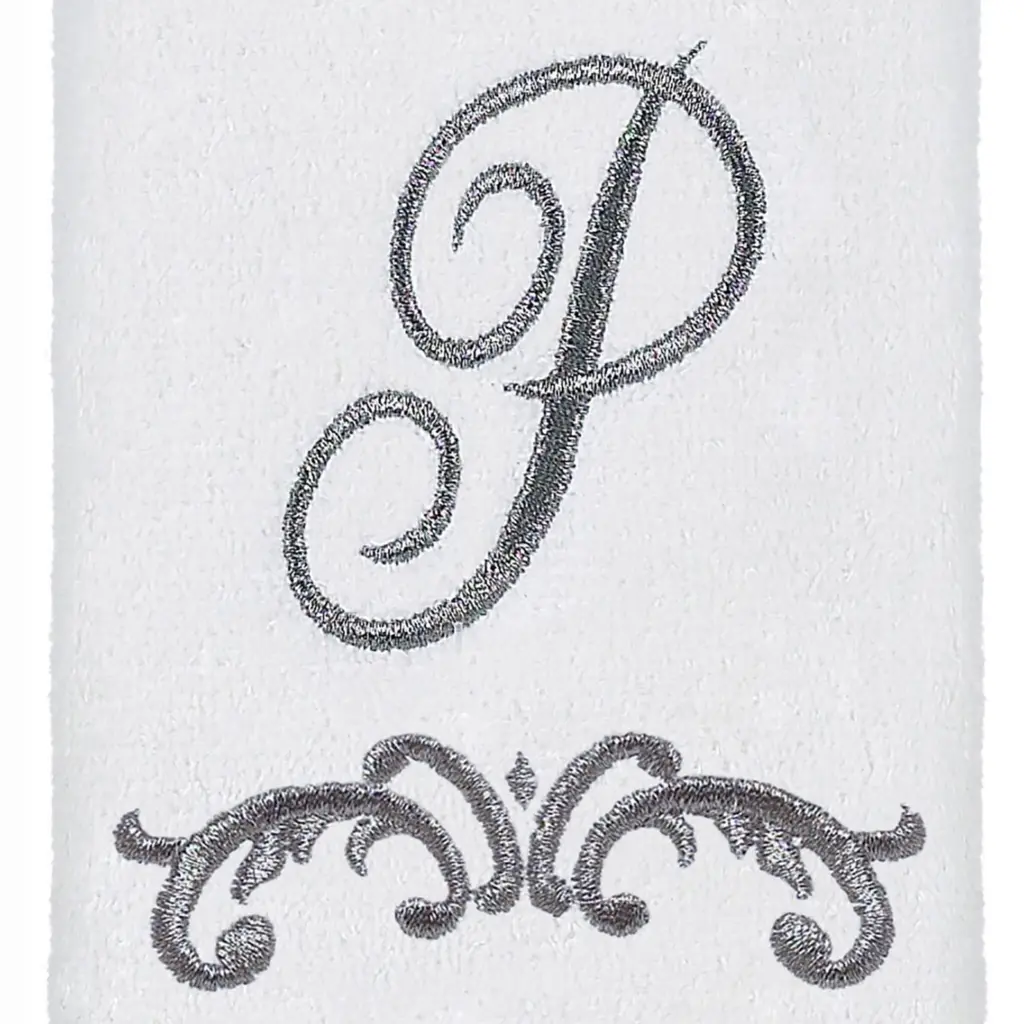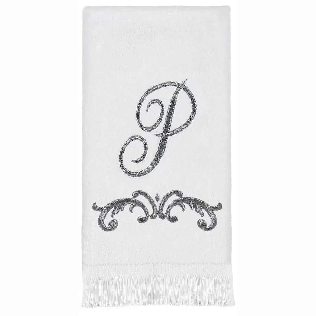 The Avanti Scroll "P" Monogram Fingertip Towel features a stylized script capital letter "P" accompanied by a decorative scroll underneath. The 11" x 18" 100% cotton velour white fringed towel is the perfect background for the metallic pewter design. Available in other letters.