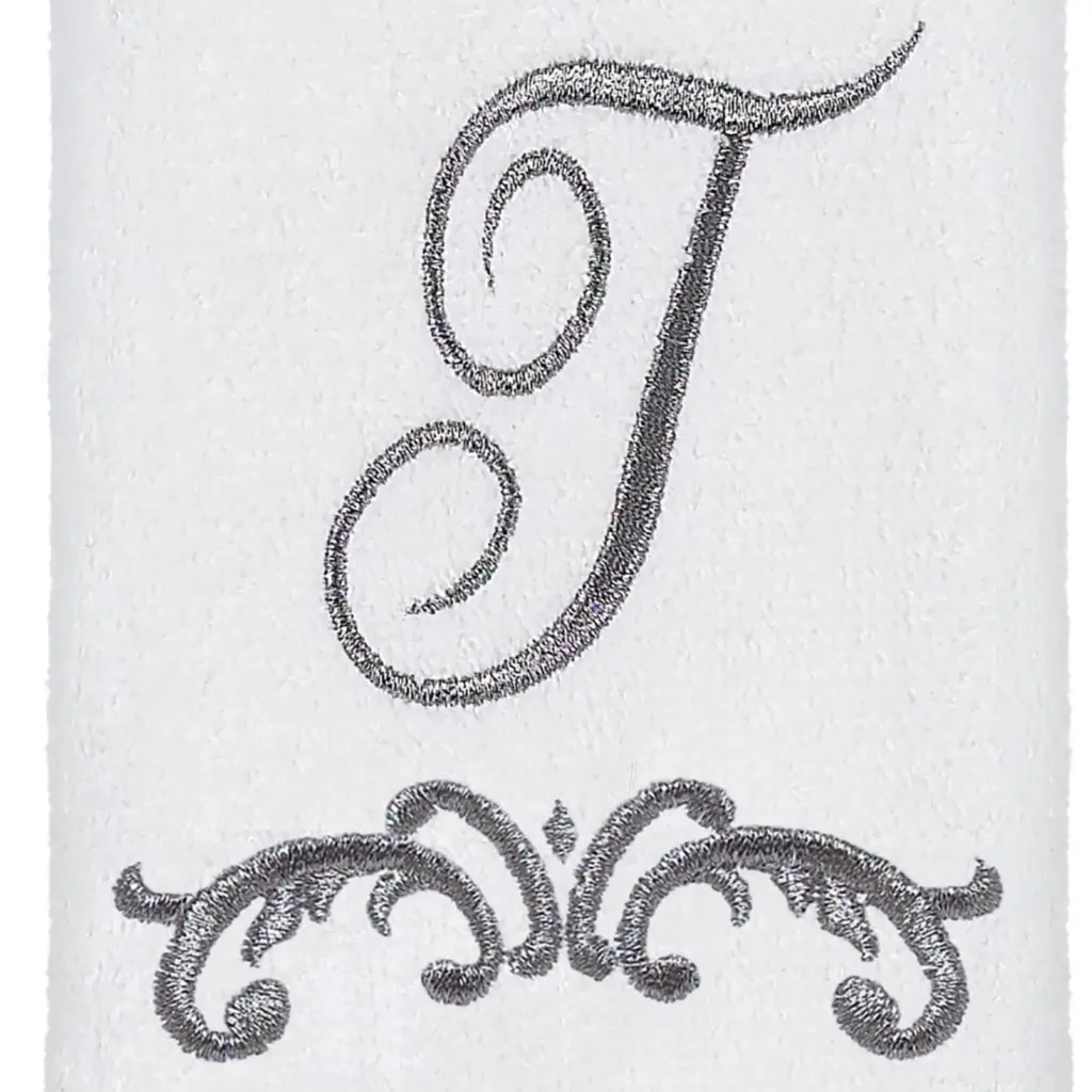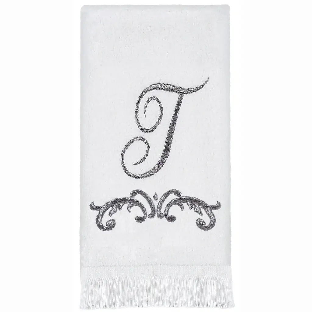 The Avanti Scroll "T" Monogram Fingertip Towel features a stylized script capital letter "T" accompanied by a decorative scroll underneath. The 11" x 18" 100% cotton velour white fringed towel is the perfect background for the metallic pewter design. Available in other letters.