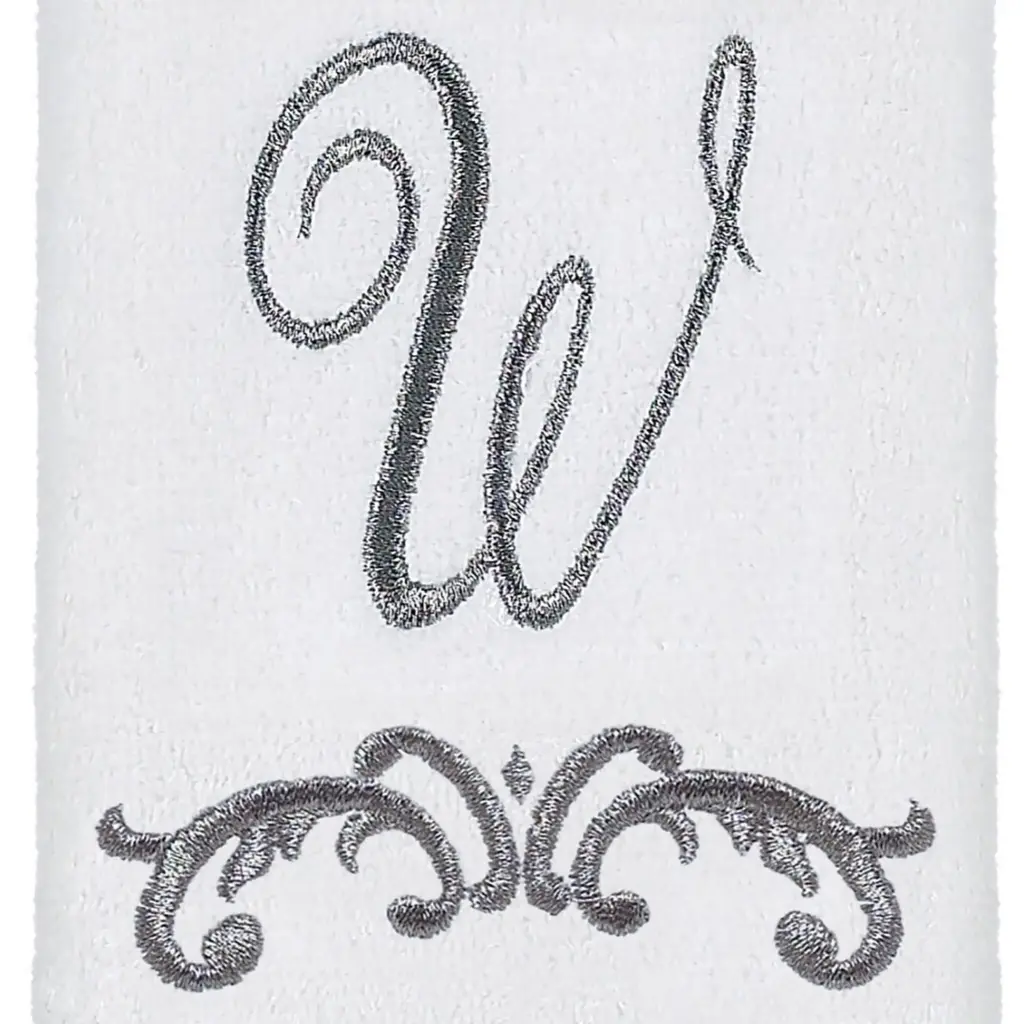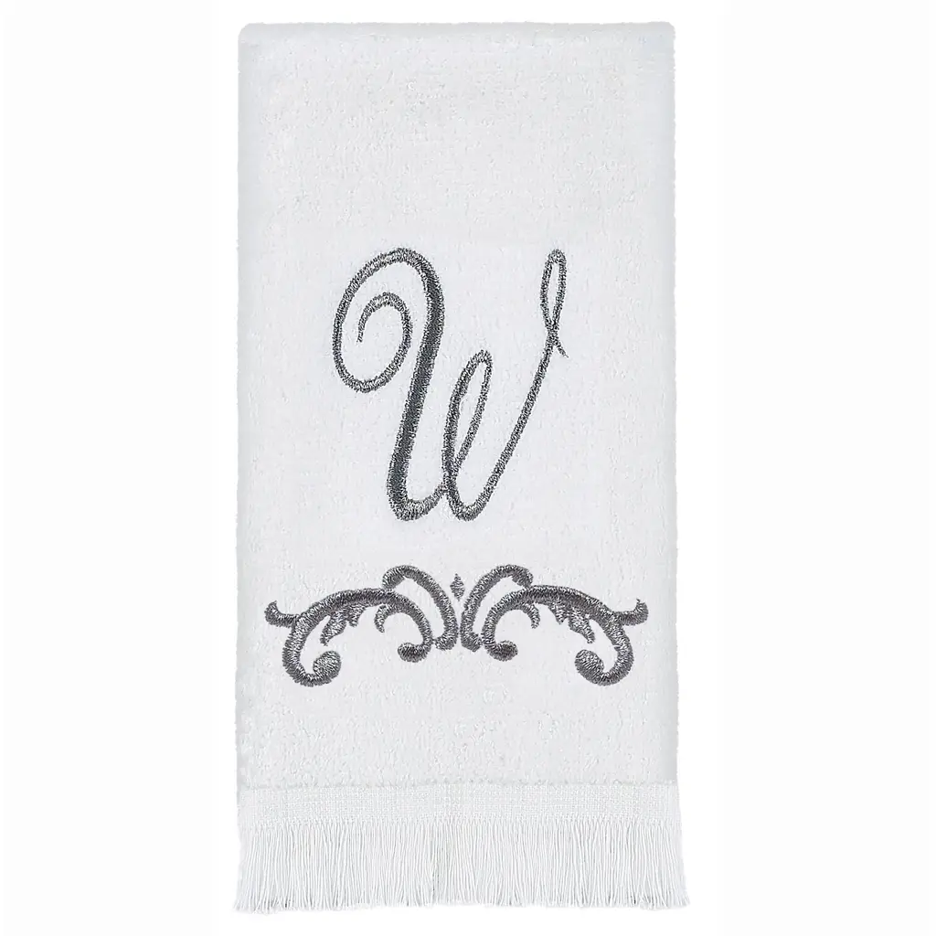 The Avanti Scroll "W" Monogram Fingertip Towel features a stylized script capital letter "W" accompanied by a decorative scroll underneath. The 11" x 18" 100% cotton velour white fringed towel is the perfect background for the metallic pewter design. Available in other letters.