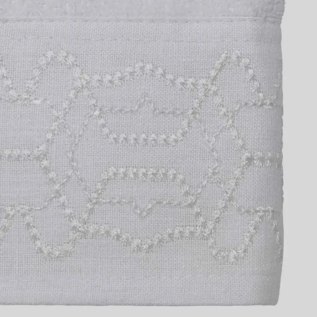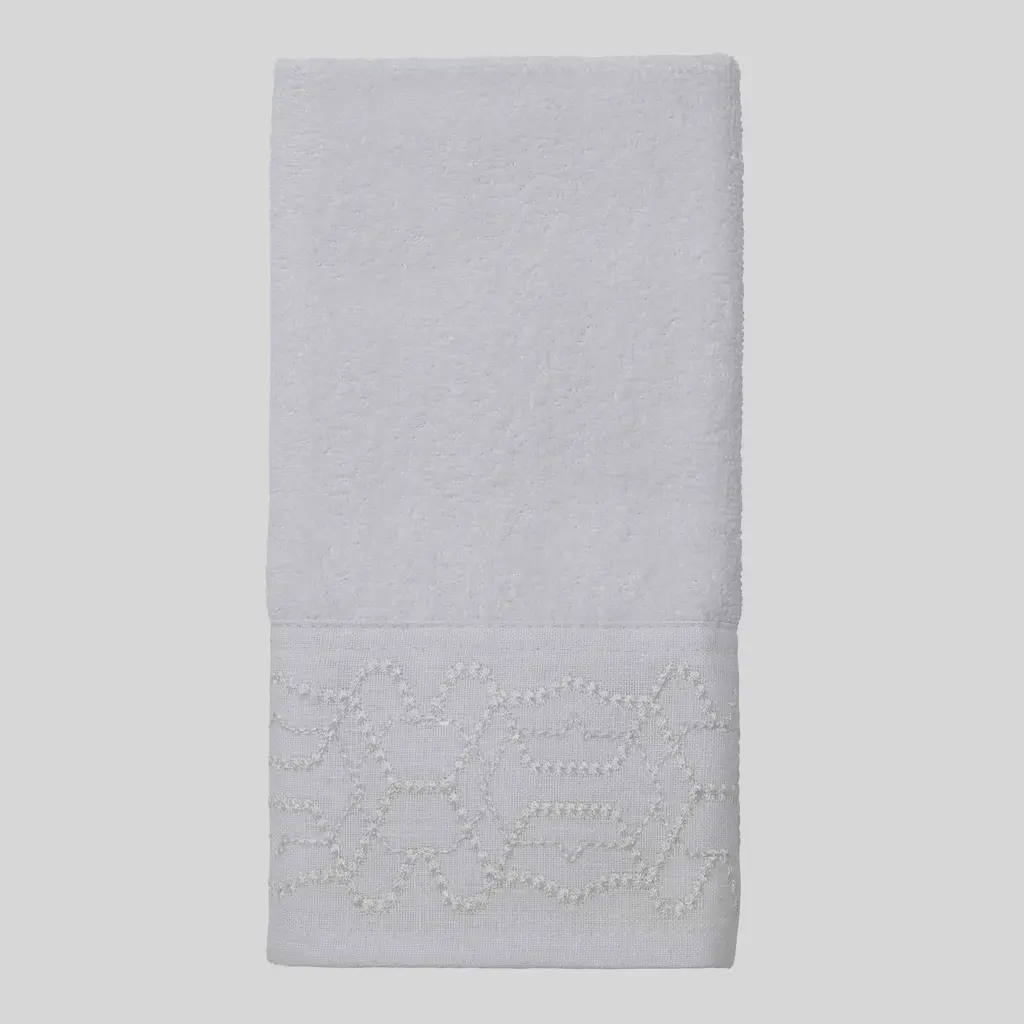 The Avanti Serafina Fingertip Towel is decorated with a dry, tonal fabric border with white embroidery forming a geometric pattern. Clear sequins add a bit of shine. The 11" x 18" 100% cotton white velour towel is sheared for an elegant, upscale look.