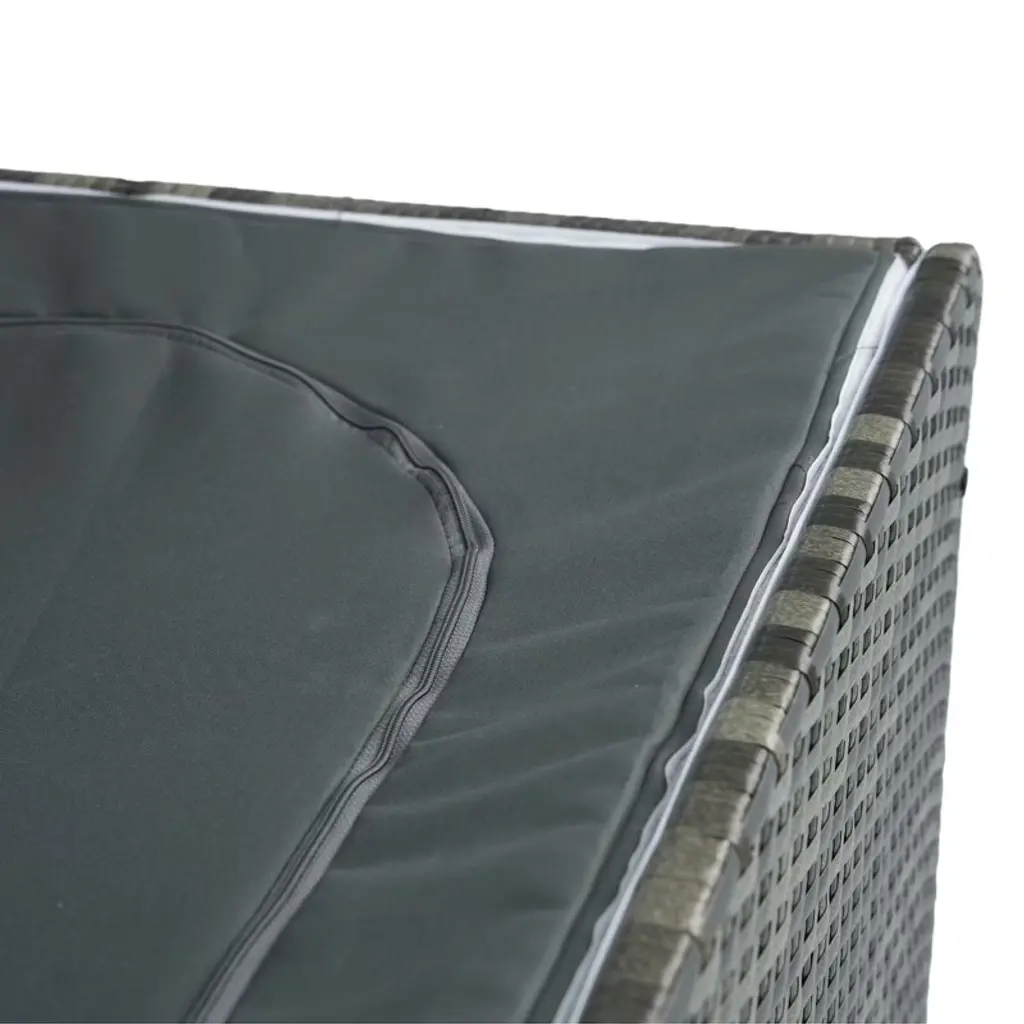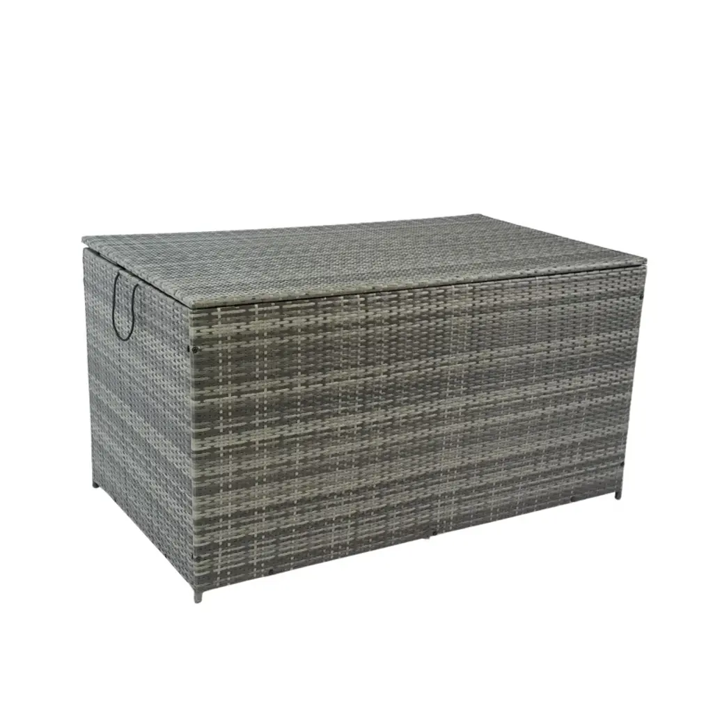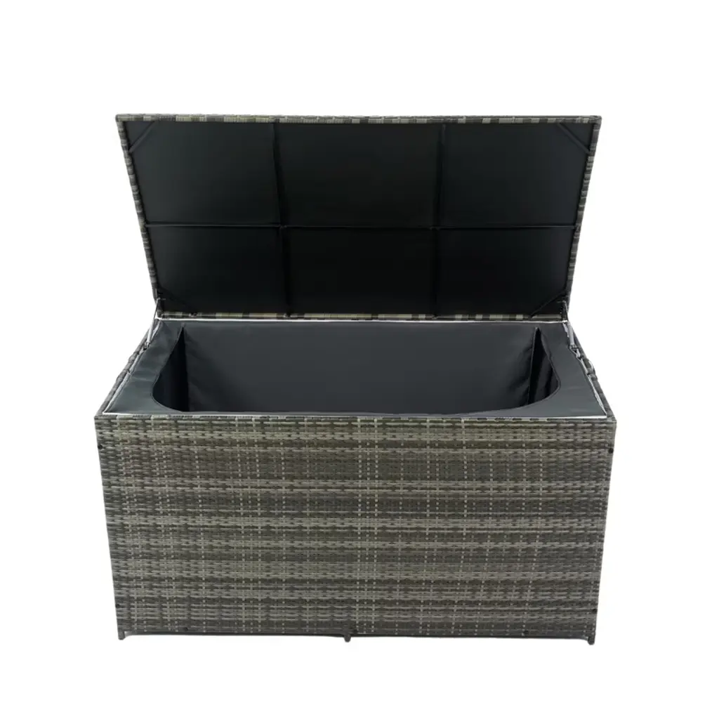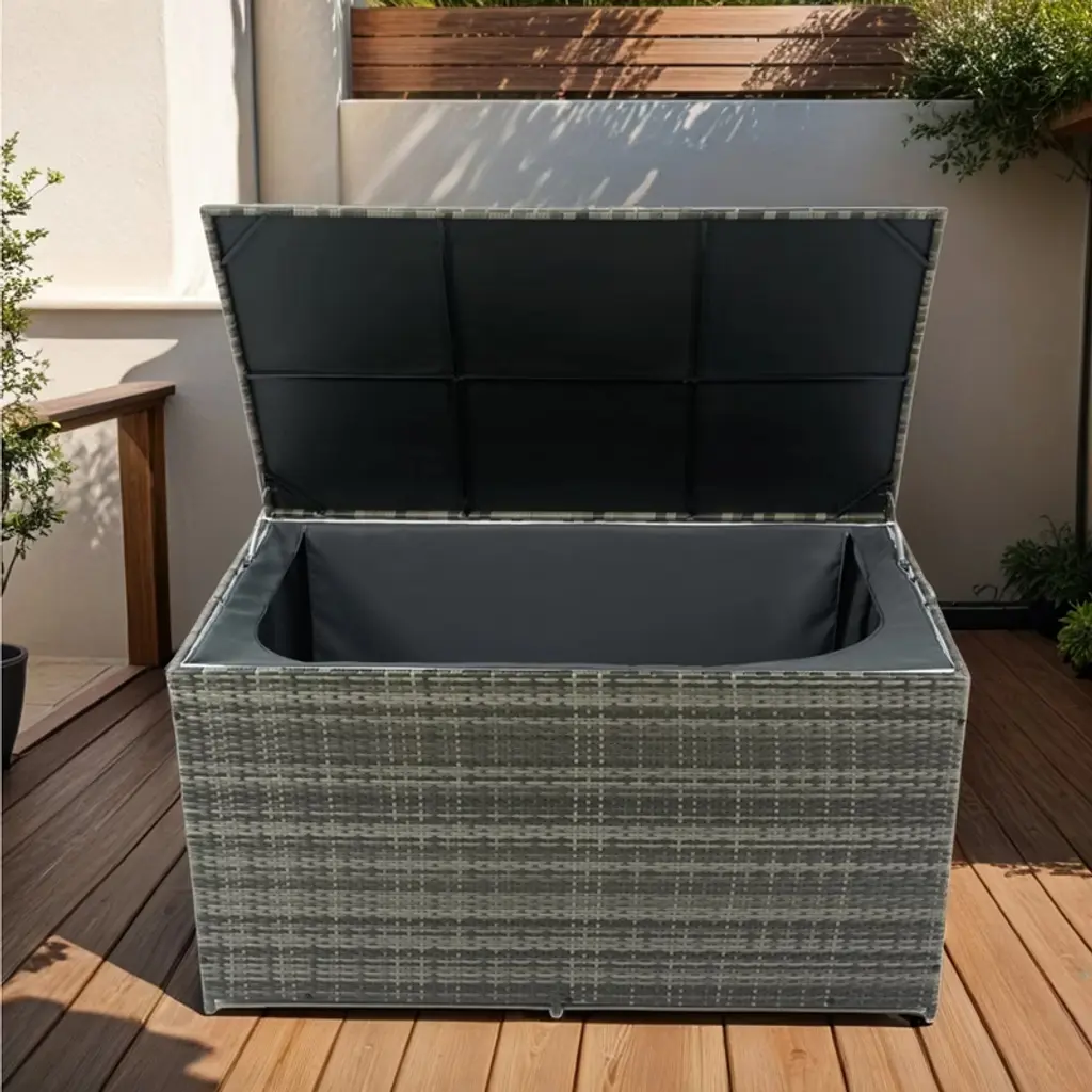 An oversized rattan storage box with a 200-gallon capacity, designed for both indoor and outdoor use. Featuring a removable waterproof liner and easy-glide safety hinges, it combines massive storage with versatile functionality.