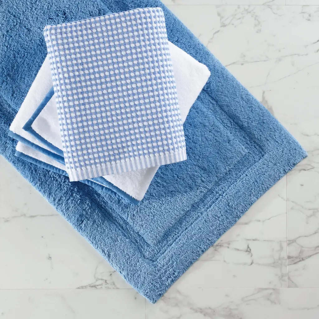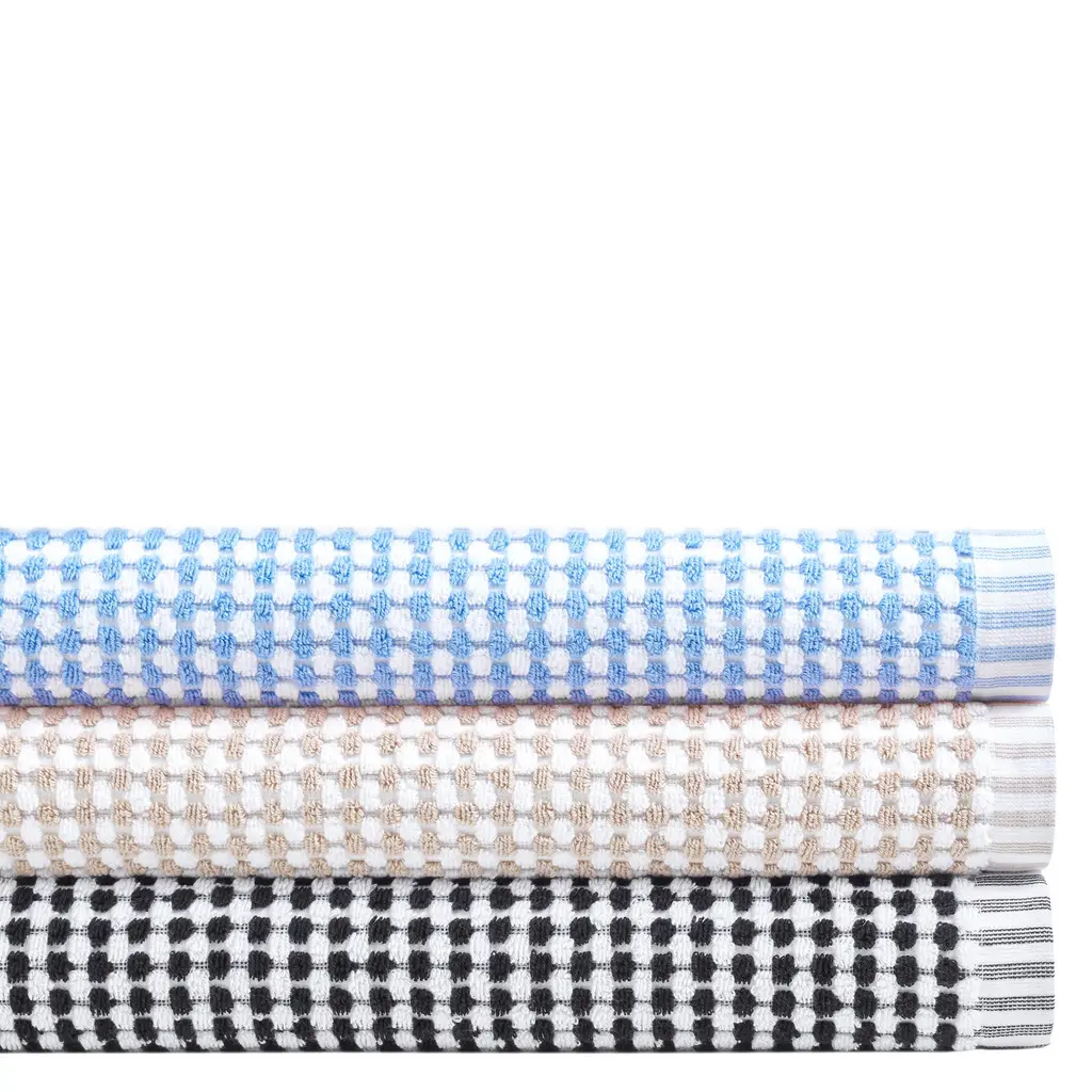 Plush and absorbent, these charming all-cotton towels are made of uncut loops dotted on a white base with end-on-end striped hems. Made in Turkey and constructed of premium Turkish cotton that has extra long fibers and becomes even softer and fluffier with successive washings.