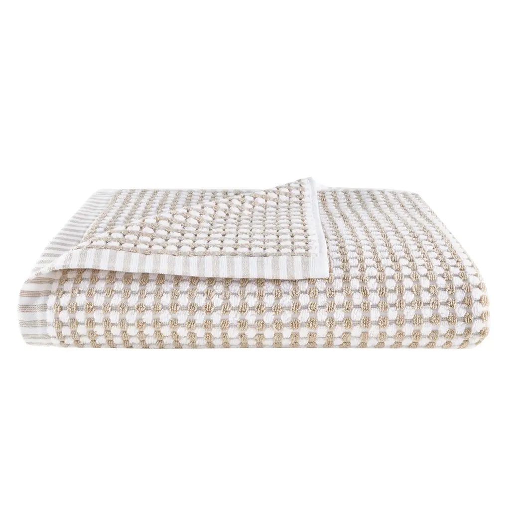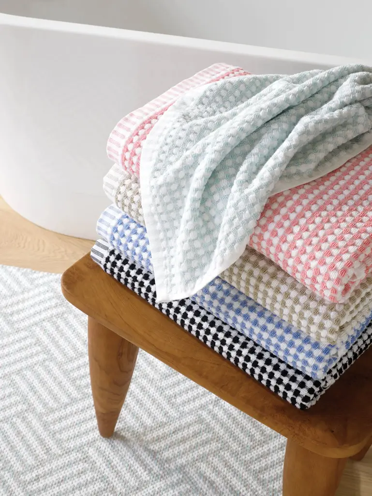 Plush and absorbent, these charming all-cotton towels are made of uncut loops dotted on a white base with end-on-end striped hems. Made in Turkey and constructed of premium Turkish cotton that has extra long fibers and becomes even softer and fluffier with successive washings.