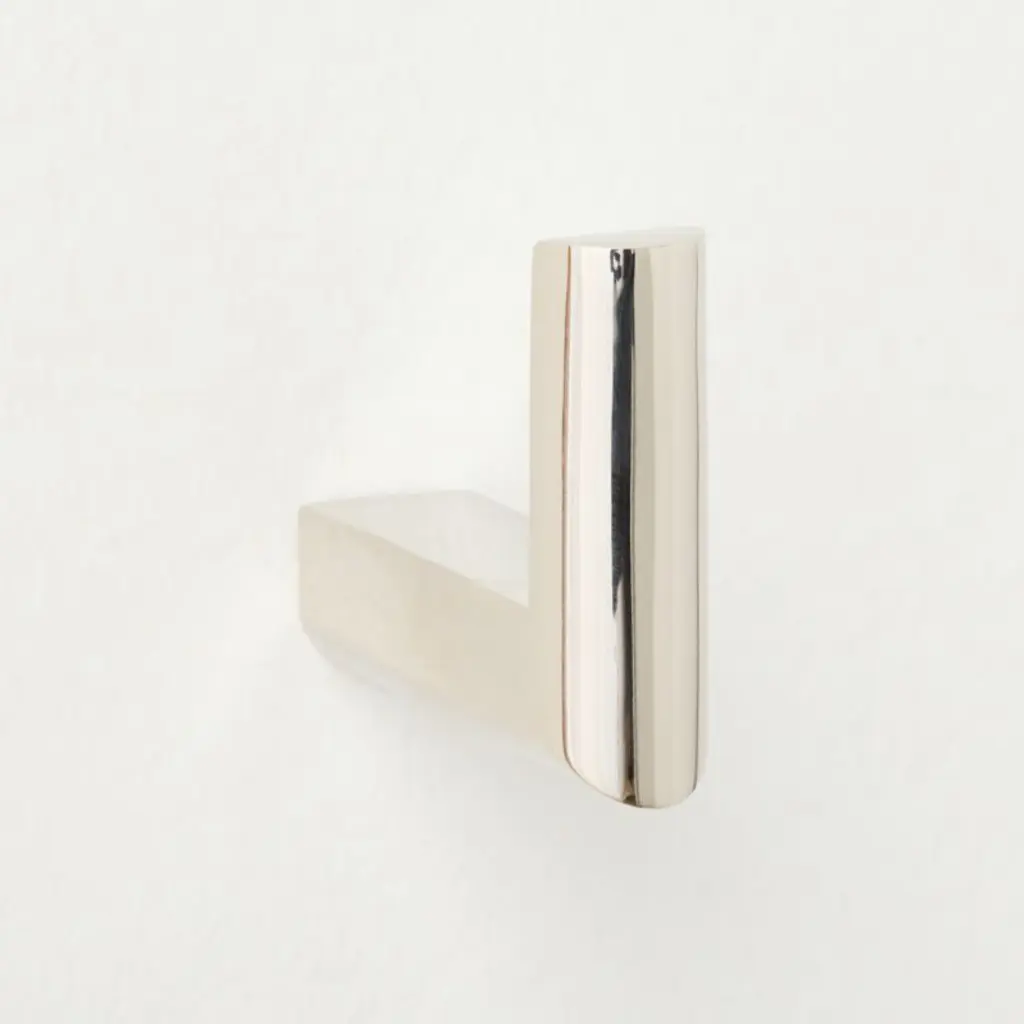 Sleek nickel-plated towel hook by Barcelona-based Mermelada Estudio curves seamlessly toward the wall for a modern look. CB2 exclusive.
