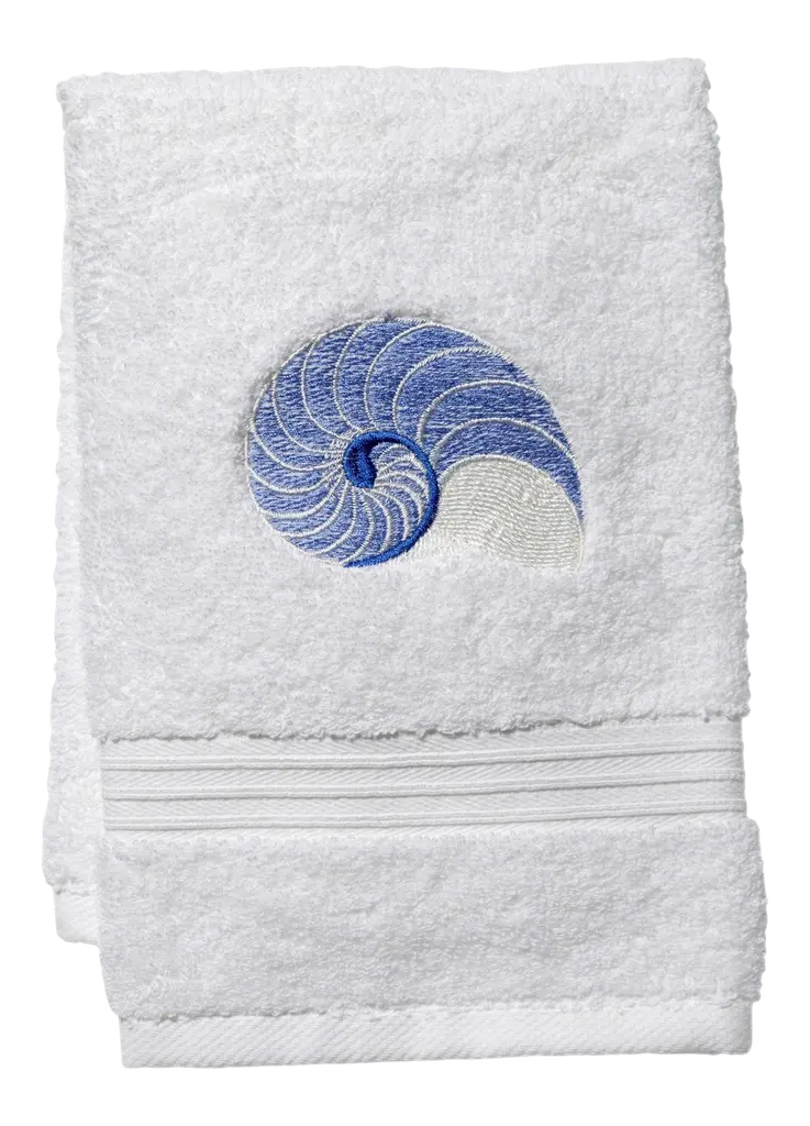 Luxurious white 100% cotton fingertip towel embroidered with a napoleon bee wreath in duck egg blue.