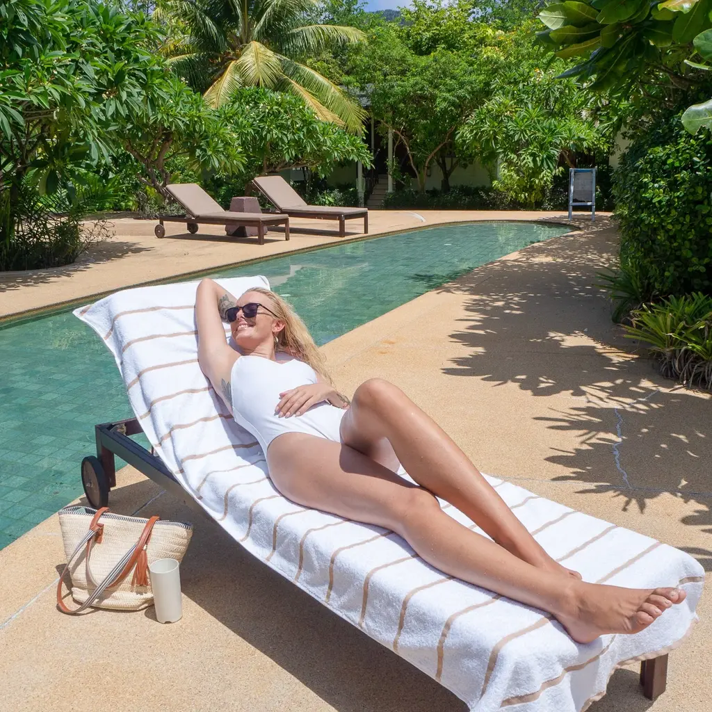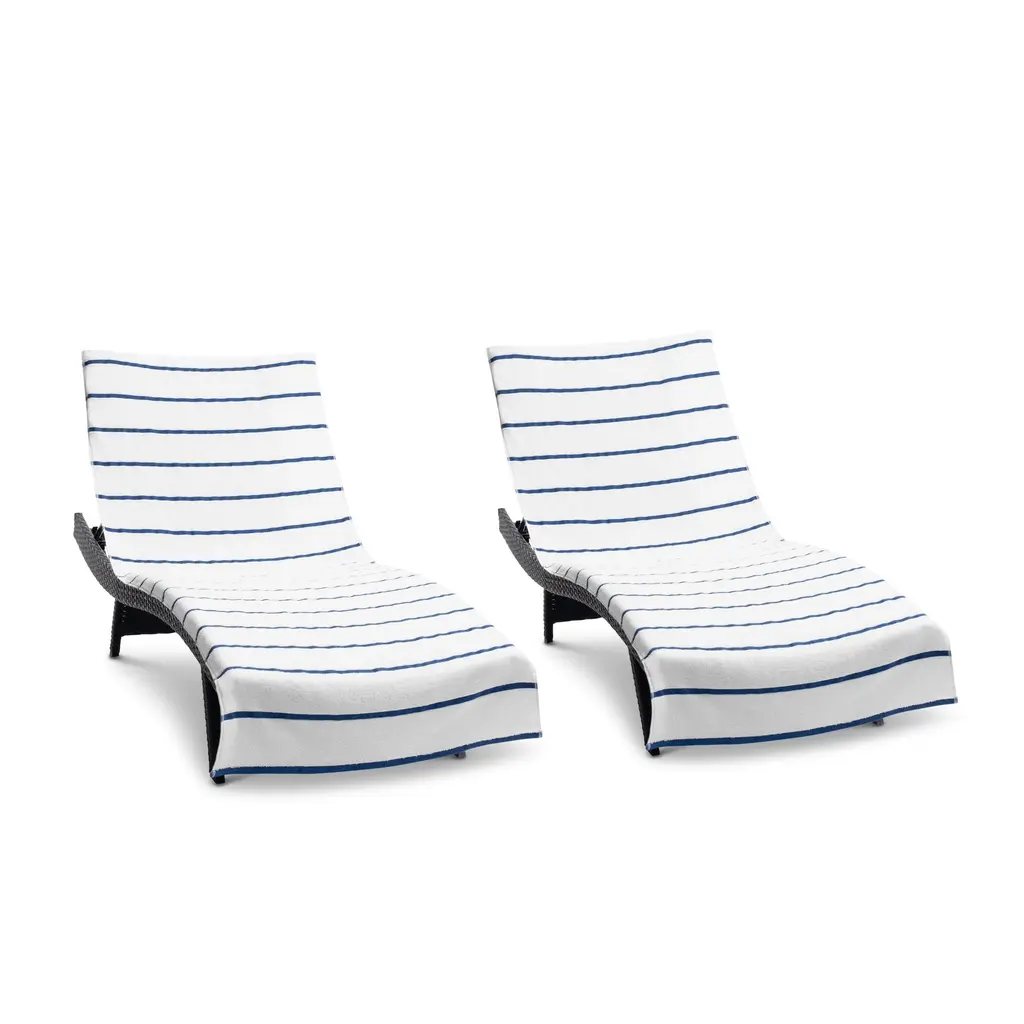 The Arkwright Las Rayas 2-Piece Chaise Lounge Covers are made with soft 100% premium cotton and is interwoven with polyester stripes for a unique look at the beach or pool. This thick, absorbent towel has charming-colored stripes running across its width and features an 8-inch pocket on one side of the towel to secure to your favorite lounge chair. Our beach towel is plush, soft, highly absorbent, and quick drying and are perfect to use these as extra-long beach towels or pool chairs. These are lightweight but absorbent towels will wick away water quickly and dry fast. Ideal beach chair towels with pockets for adults or for kids at a beach, pool, resort, Airbnb bed and breakfast, VRBO vacation rental, beach house or hotel. Machine Wash with like colors. Do not bleach. Tumble dry low. Always wash new towels before use as some lint may be generated. Features:Dimensions:
