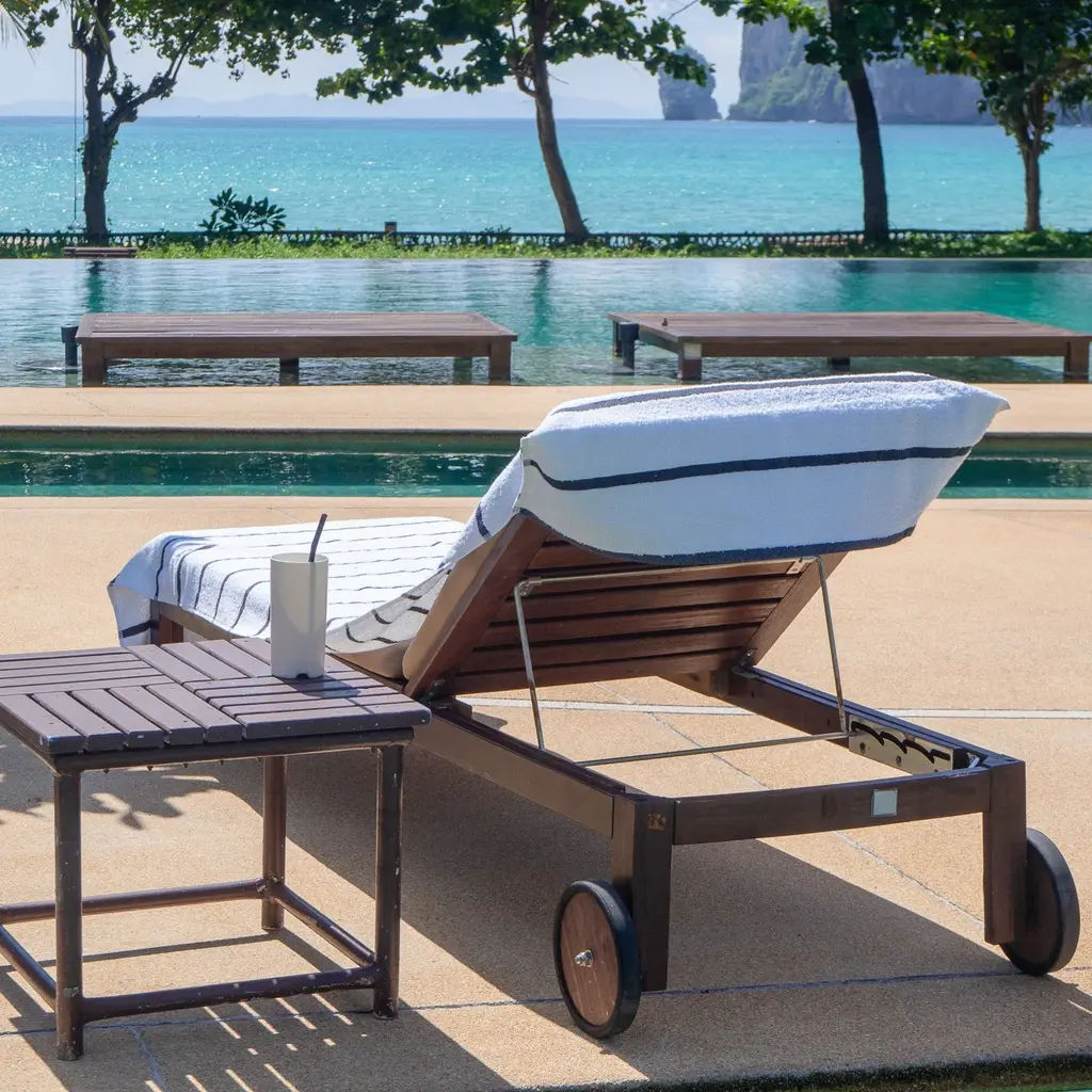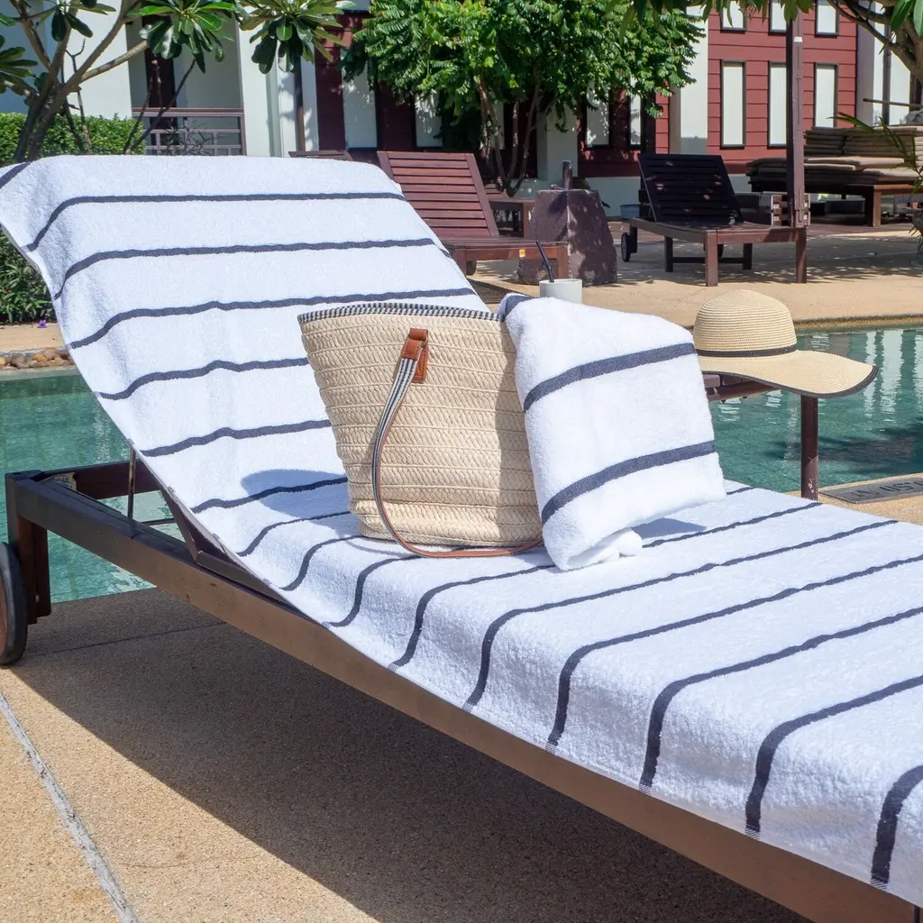 The Arkwright Las Rayas 2-Piece Chaise Lounge Covers are made with soft 100% premium cotton and is interwoven with polyester stripes for a unique look at the beach or pool. This thick, absorbent towel has charming-colored stripes running across its width and features an 8-inch pocket on one side of the towel to secure to your favorite lounge chair. Our beach towel is plush, soft, highly absorbent, and quick drying and are perfect to use these as extra-long beach towels or pool chairs. These are lightweight but absorbent towels will wick away water quickly and dry fast. Ideal beach chair towels with pockets for adults or for kids at a beach, pool, resort, Airbnb bed and breakfast, VRBO vacation rental, beach house or hotel. Machine Wash with like colors. Do not bleach. Tumble dry low. Always wash new towels before use as some lint may be generated. Features:Dimensions:
