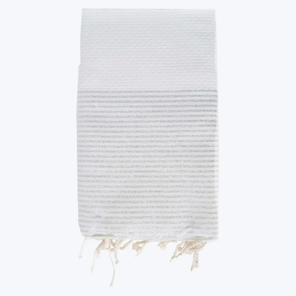 Discover the Lurex Fouta Towel by Scents & Feel, a refined addition to worldly, contemporary interiors. Crafted in 100% natural cotton, this elegant towel features metallic Lurex® stripes for a luxurious feel. Use it as a wrap, runner, or throw. Made in Tunisia. Available in Beige/Gold, Gray/Silver, and White/Silver editions.