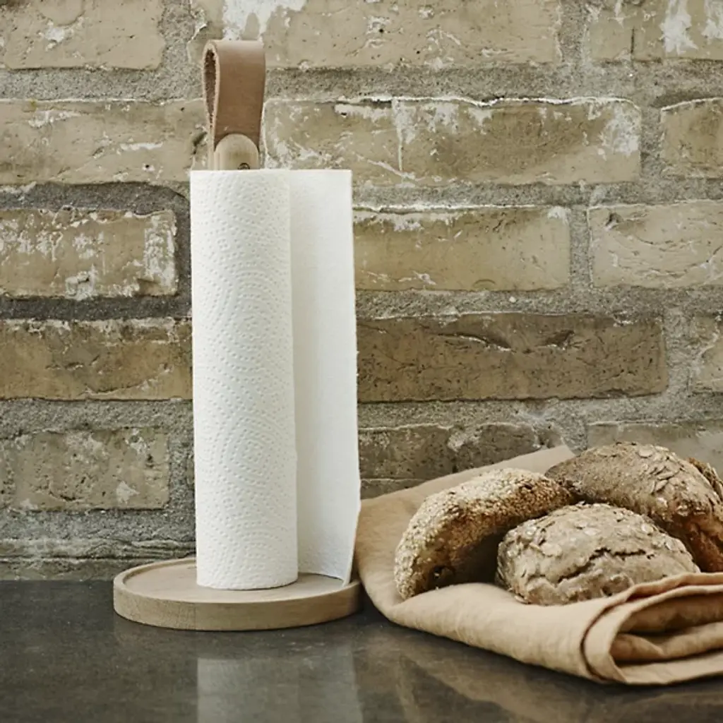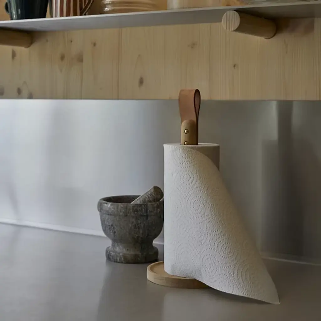 Bring a dash of minimalism to your kitchen with the Norr Paper Towel Holder from Fritz Hansen. Crafted from oak, this holder features a sturdy circular base and an elegant leather loop at the top. A linear shape makes your paper towels easy to grab. The clean-lined wooden base adds texture, while elegant leather adds refinement.