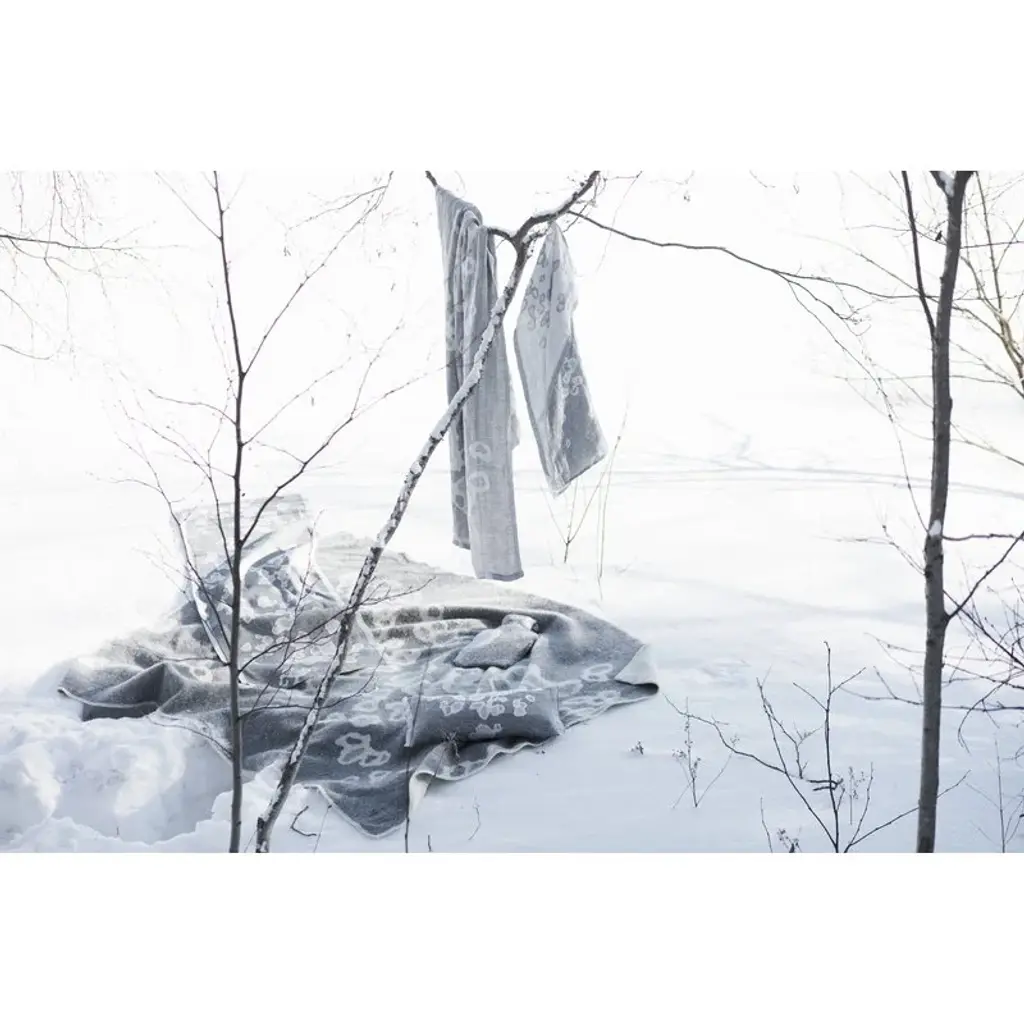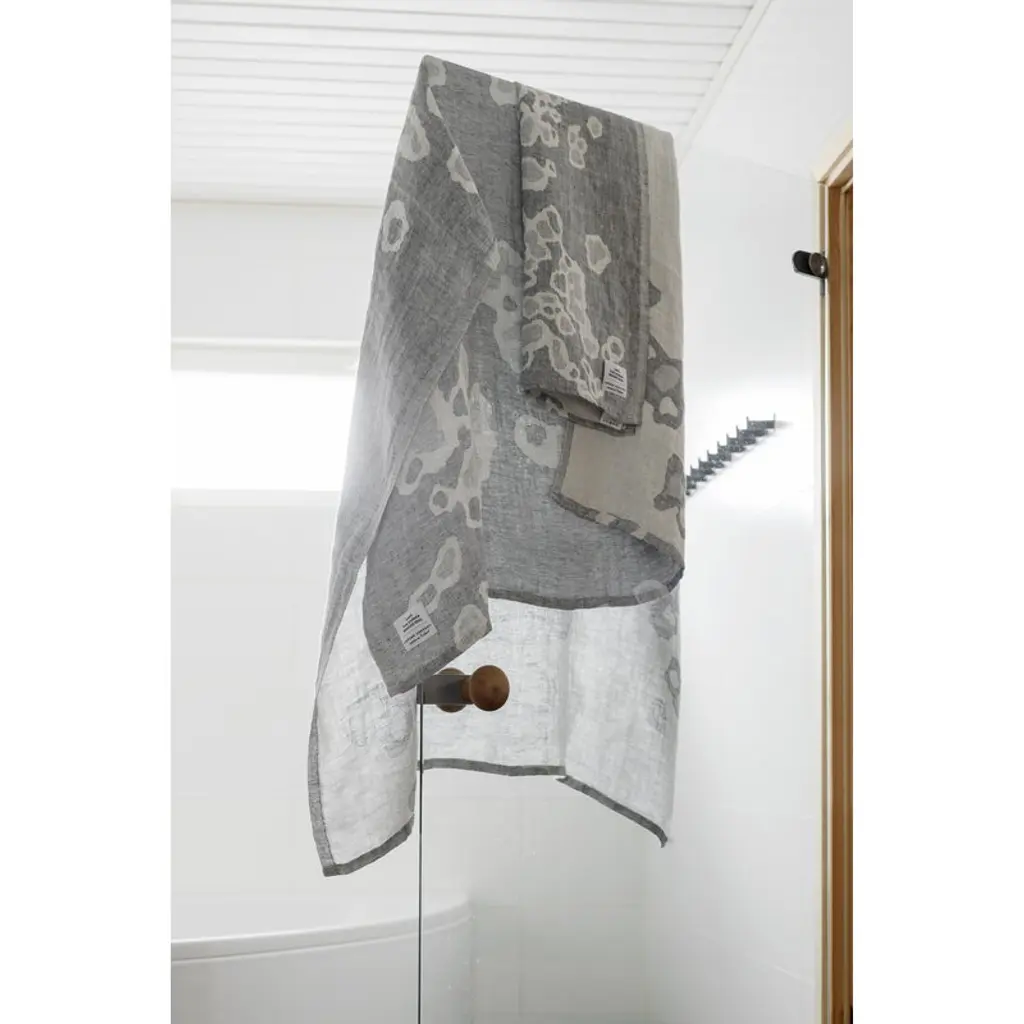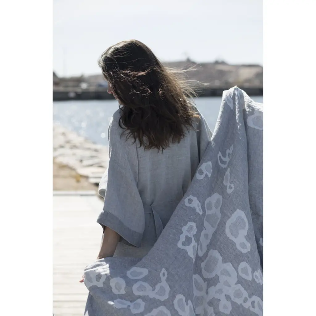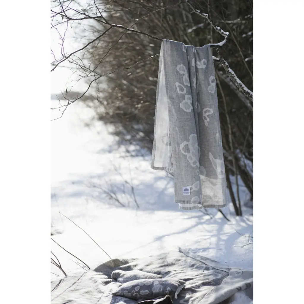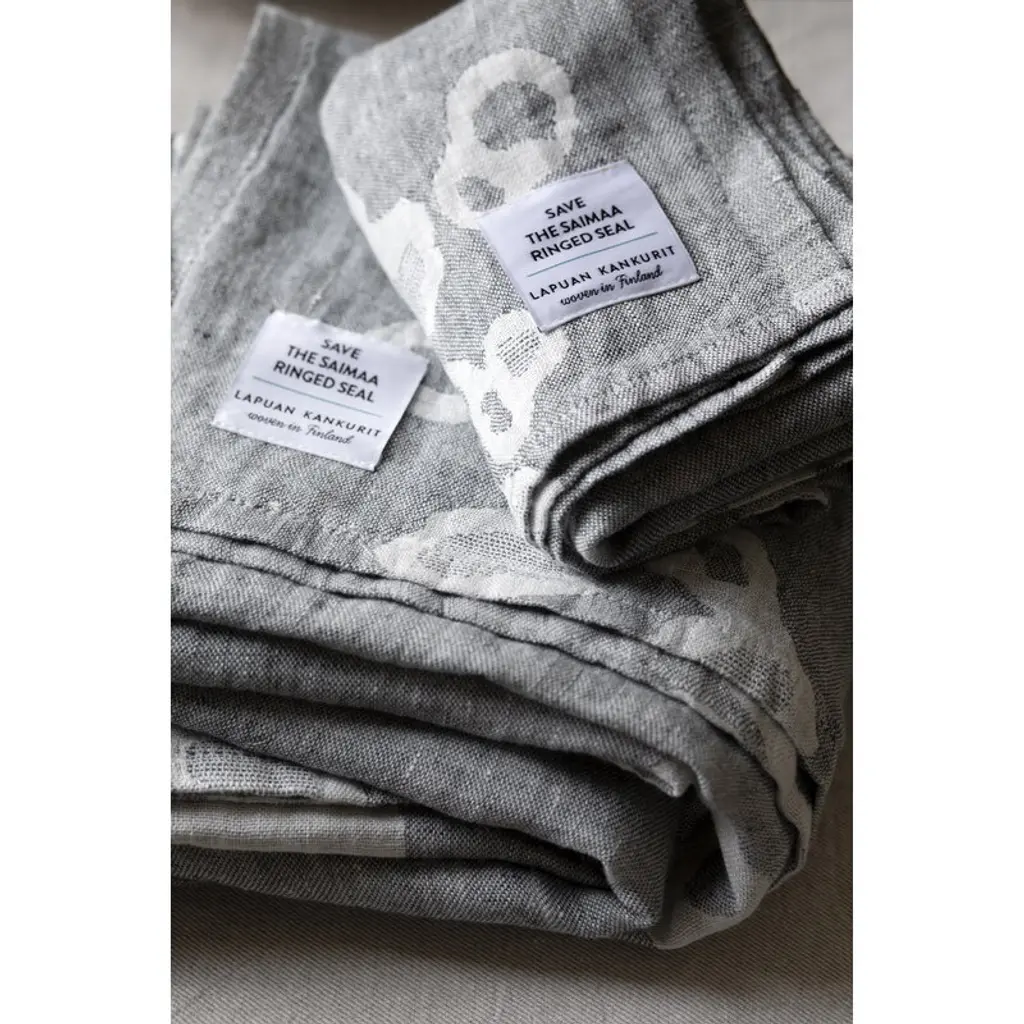 The Saimaannorppa giant towel by Lapuan Kankurit is adorned with Kaarina Tiainen’s graphic, white-gray pattern that mimics the spots of the Saimaa ringed seal, an endangered seal living only in Lake Saimaa, Finland. Made of 100% linen, the towel has been woven in Finland at the own weaving mill of Lapuan Kankurit. With the Saimaannorppa collection, Lapuan Kankurit participates in protecting the endangered seal: for every sold giant towel, 2,80 € is donated for the Finnish Association for Nature Conservation to the protection of the Saimaa ringed seal. The products of the collection have a woven Save the Saimaa Ringed Seal logo.