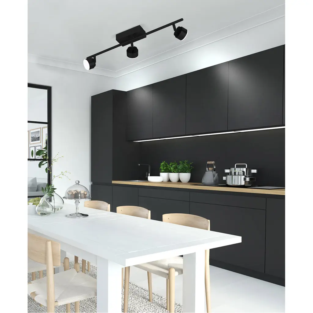 The Armento Integrated LED fixed track light by Eglo provides an abundance of light and sophistication to your interior space. It features a black finish with multi-directional drum shaped lamp heads with white plastic diffusers. This light can be wall or ceiling mounted