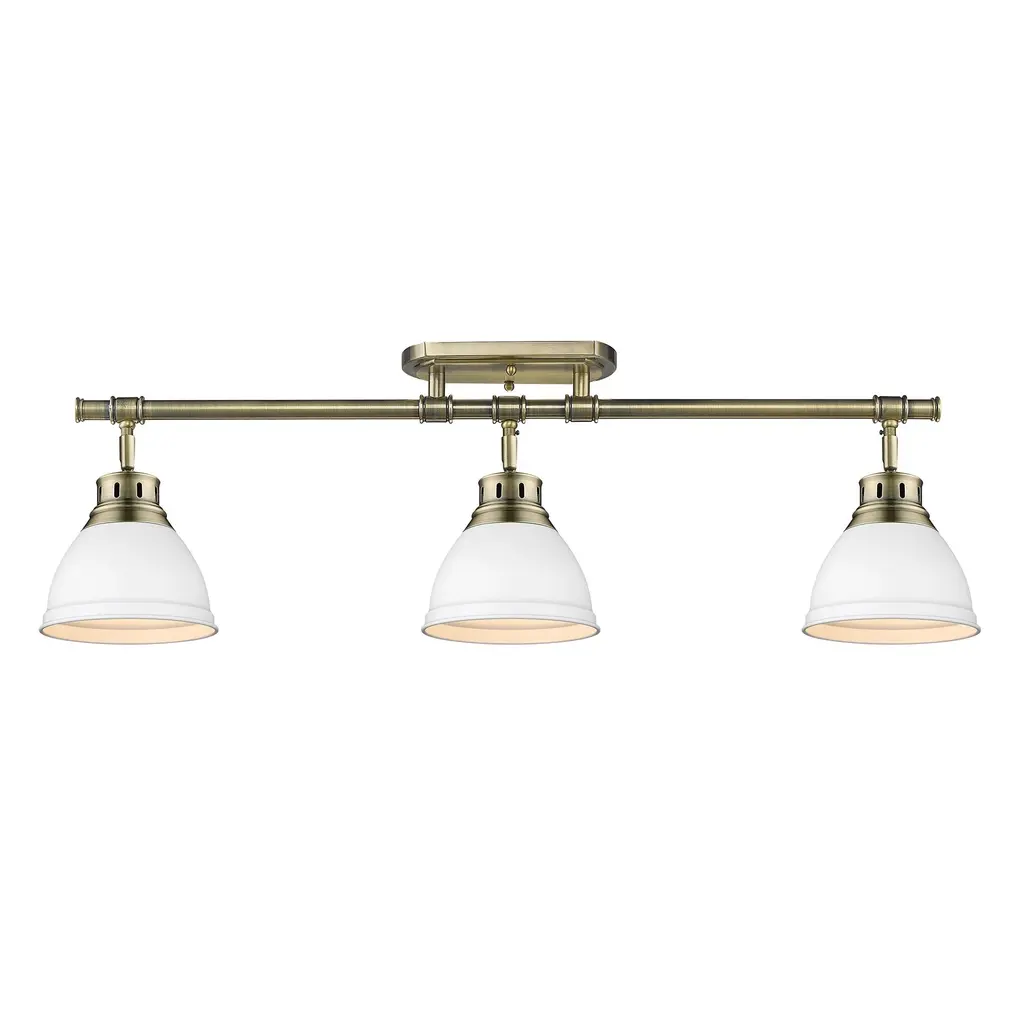 Transform the look of your room with this classic, vintage-inspired fixture by Golden Lighting. Golden Lighting's Duncan collection is contemporary style with an industrial feel. The collection features a variety of simple, traditional silhouettes that are a nod to a bygone era. A variety of plated and painted metal shade finishes are offered in combination with durable Aged Brass, Black, Chrome or Pewter fixture bodies. The Rubbed Bronze fixtures are paired with Rubbed Bronze shades. This 3-light semi-flush is highly versatile and maneuverable. The swivel on the canopy moves 90 degrees allowing the fixture to be mounted on the wall or ceiling. The fixture's shades can also be positioned freely. This aged brass 3-light semi-flush track light is paired with chrome shades. The shades are a shiny, reflective metallic.
