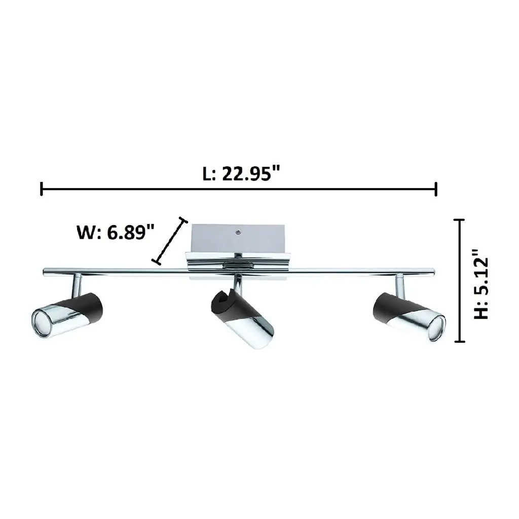 FeaturesAdjustable lamp headsMounting hardware is includedMultiple directional lightFrame finish: ChromeFrame material: SteelShade finish: Chrome, BlackShade material: MetalInstall orientation: Wall or CeilingDimmableVoltage: 120Requires three (3) 4.4-watt Integrated LED modules (included)DimensionsCanopy dimensions: 4.53 inches wide x 5.31 inches long x 1.77 inches thickShade dimensions: 3 inches high x 2.5 inches wideDimensions: 6.89 inches high x 22.95 inches wide x 5.12 inches deep