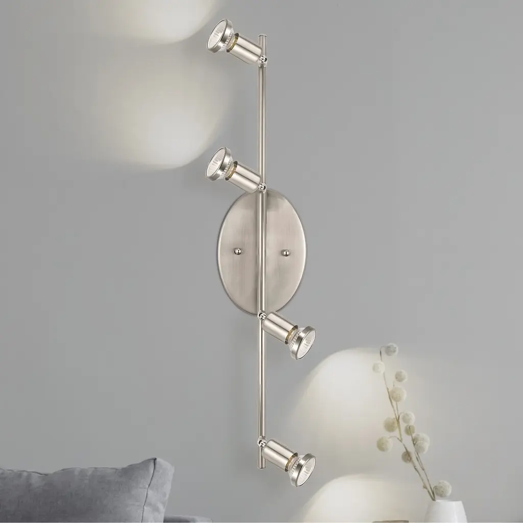 The Eglo Buzz 4-light track light uses simple, stylish design to function as a sharp contemporary or transitional fixture. With adjustable halogen lights and a clean matte nickel finish, the fixture will accent your modern decor. The multifunctional lights work great as directional accent lighting and task lighting.Adjustable light headsLED compatibleDimmer compatible (not included)Multiple light directionFrame finish: Matte NickelFrame material: SteelVoltage: 120Dimmer CompatibleRequires four (4) 50-watt GU10 Halogen base bulb(s) (not included)Canopy dimensions: 7.4 inches wide x 0.86 inches thickDimensions: 5.11 inches high x 25.2 inches wide x 3.38 inches deep
