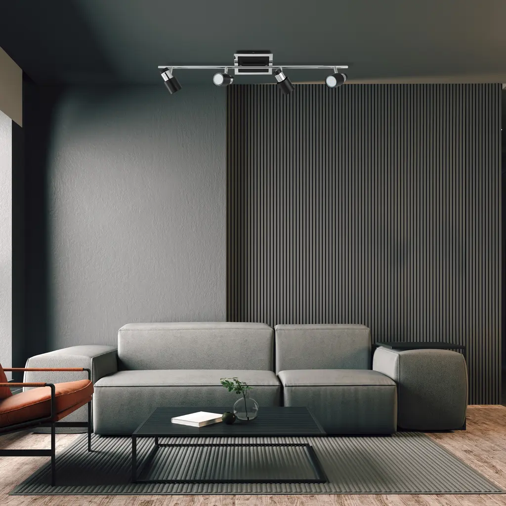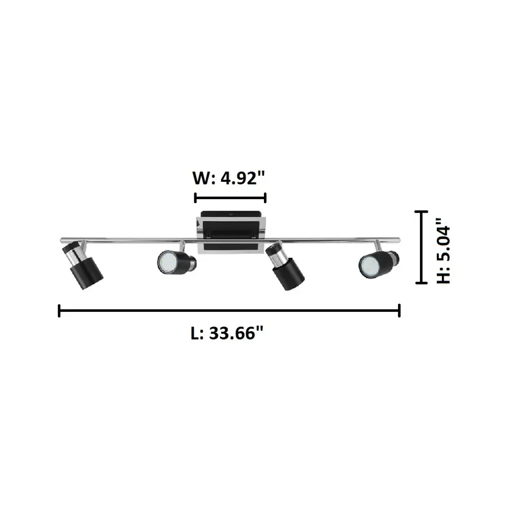 Brighten up any room with Eglo's Davida-2 track light! It boasts 4 track heads in a matte black finish and chrome accent. Applicable indoors, this contemporary track light is energy efficient and suitable for many settings. Perfect for the hallway, bedroom, basement and kitchen, it's a purchase you won't regret!FeaturesLED compatibleAdjustable lamp headsMounting hardware is includedMultiple directional lightFrame finish: ChromeFrame material: SteelShade finish: ChromeShade material: MetalInstall orientation: Ceiling or WallDimmableVoltage: 120Requires four (4) 10-watt MR16 GU10 halogen bulbs (not included)DimensionsCanopy dimensions: 5.38 inches wide x 4.5 inches long x 1 inches thickShade dimensions: 4.13 inches high x 2.25 inches wideDimensions: 5.04 inches high x 33.66 inches wide x 4.95 inches deep