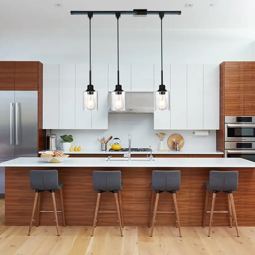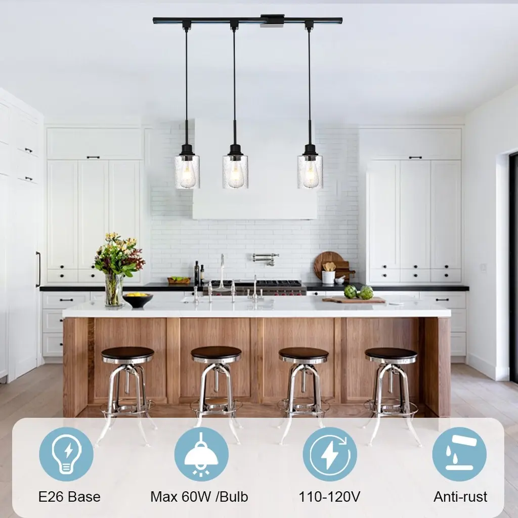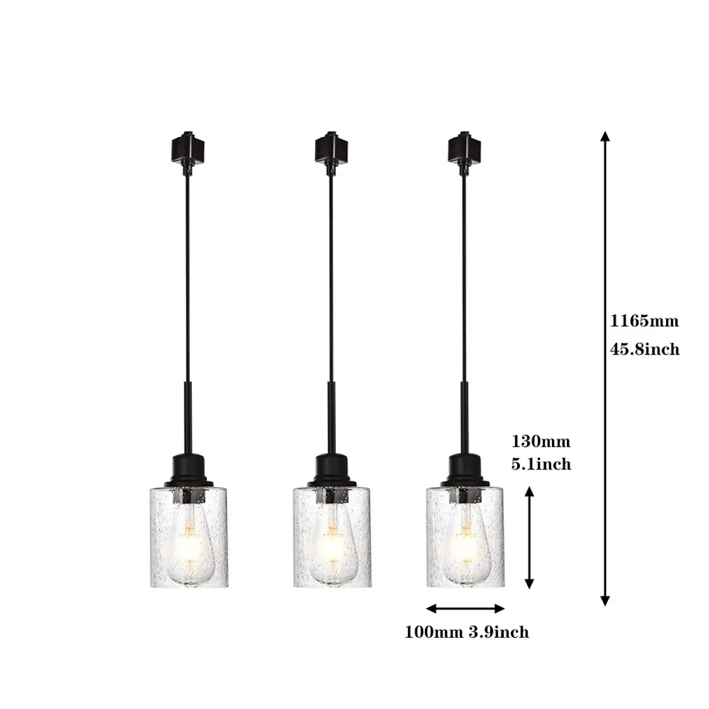 Elevate your space with this dimmable track mount pendant lighting fixtures featuring a striking black metal frame and elegant seeded glass shades. Perfect for adding a touch of sophisticated vintage flair to both modern and classic interiors. H-Type Track Compatibility Easy Installation Bulb Requirements NOTE